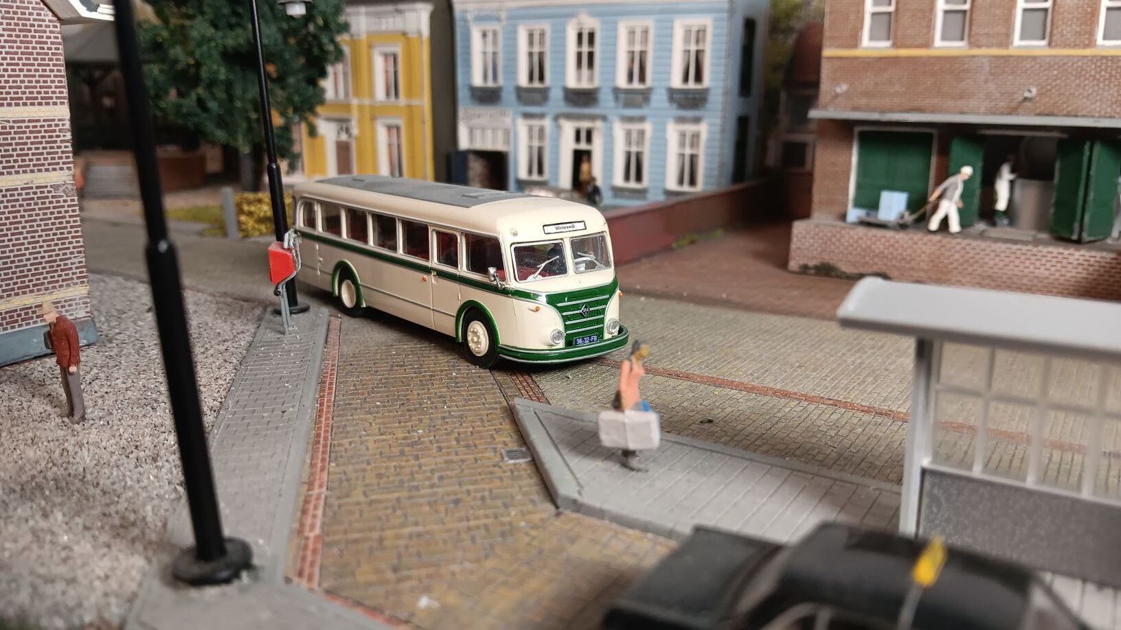 De IFA bus staat op NL kenteken en is onderweg naar Winterswijk. Ik vind het moeilijk om een bus te vinden uit deze periode die in NL heeft gereden. De kleurstelling van deze bus benadert een beetje die van de gelderse tramwegen. Maar het blijft een compromis. Tips hierover zijn welkom.