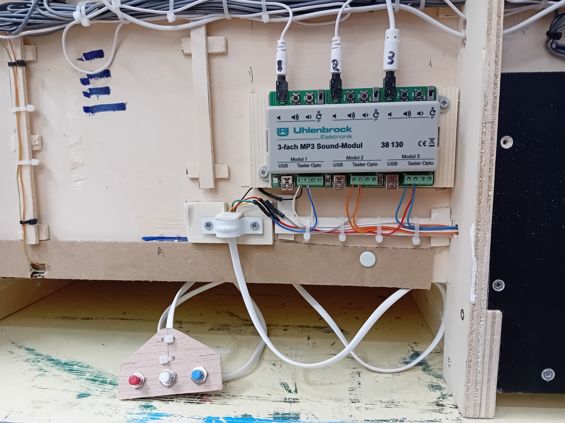 De elektronica voor het aansturen van de geluidsmodule is gemonteerd op de achterwand.