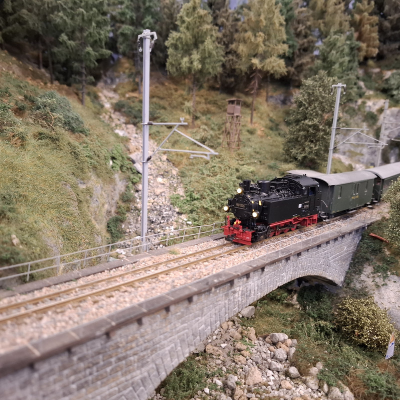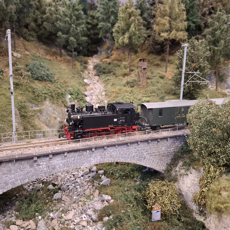 Ik heb lange tijd niets gepost in dit draadje. Vorige week ontving ik de BEMO Stoomlok VI K 99-705. Een DR Stoomlok, dus wellicht wat vreemde eend in de bijt, echter een West-Duits zusje van deze lok reed ooit tussen Nagold en Altensteig op 1000m spoor. Deze lok is na sluiting van het traject als museumlok naar Zwitserland vervoerd. Hij rijdt nu op de Museumsbahn Blonay-Chamby. Dus dit zusje kan best op de RhB als museum lok en trein worden ingezet.  OP bijgaande foto's is de lok met RhB museum trein onderweg kort na Dürrboden.
