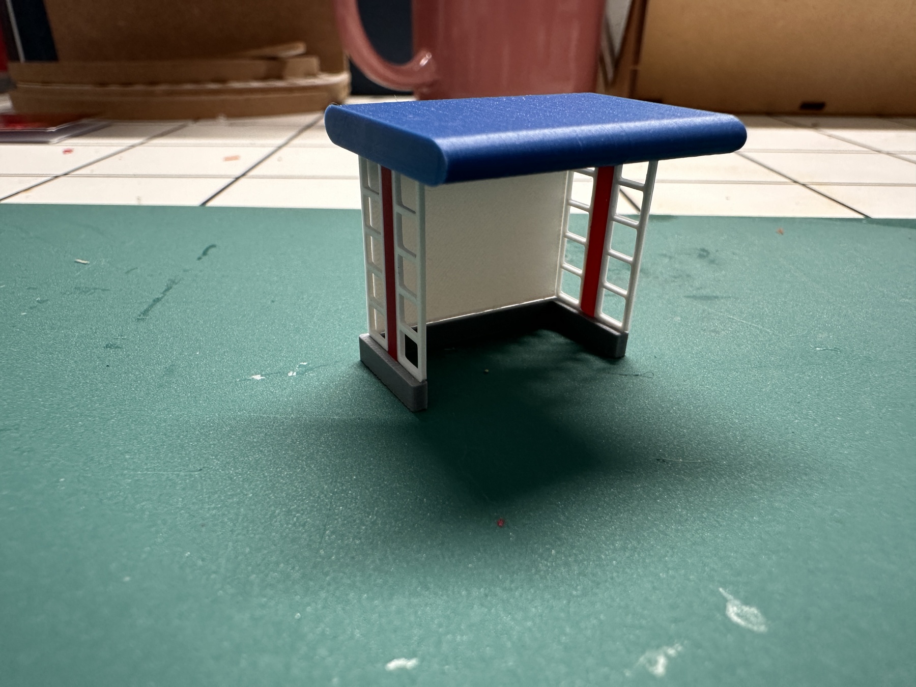 Daarnaast ga ik het perron wat aanpassen. Dit is toendertijd gemaakt met de beschikbare middelen maar klopt niet helemaal met het beeld wat ik wil uitstralen. Ik ben bijzonder fan van de kleurrijke jaren 80 stations en dito unieke wachthuisjes. Op basis van een foto welke ik tegenkwam van station Amsterdam Vlugtlaan deze wachtruimte nagemaakt: