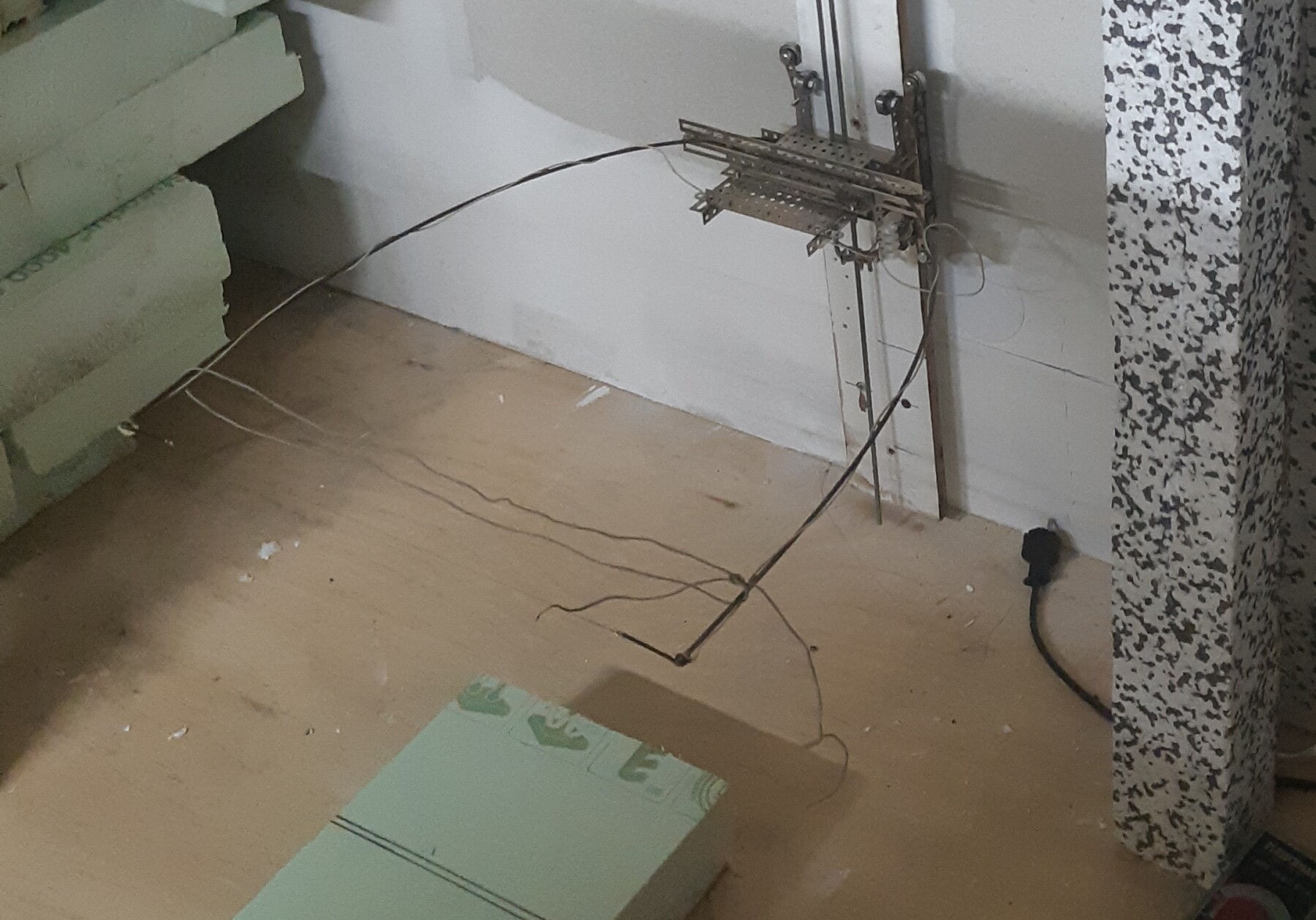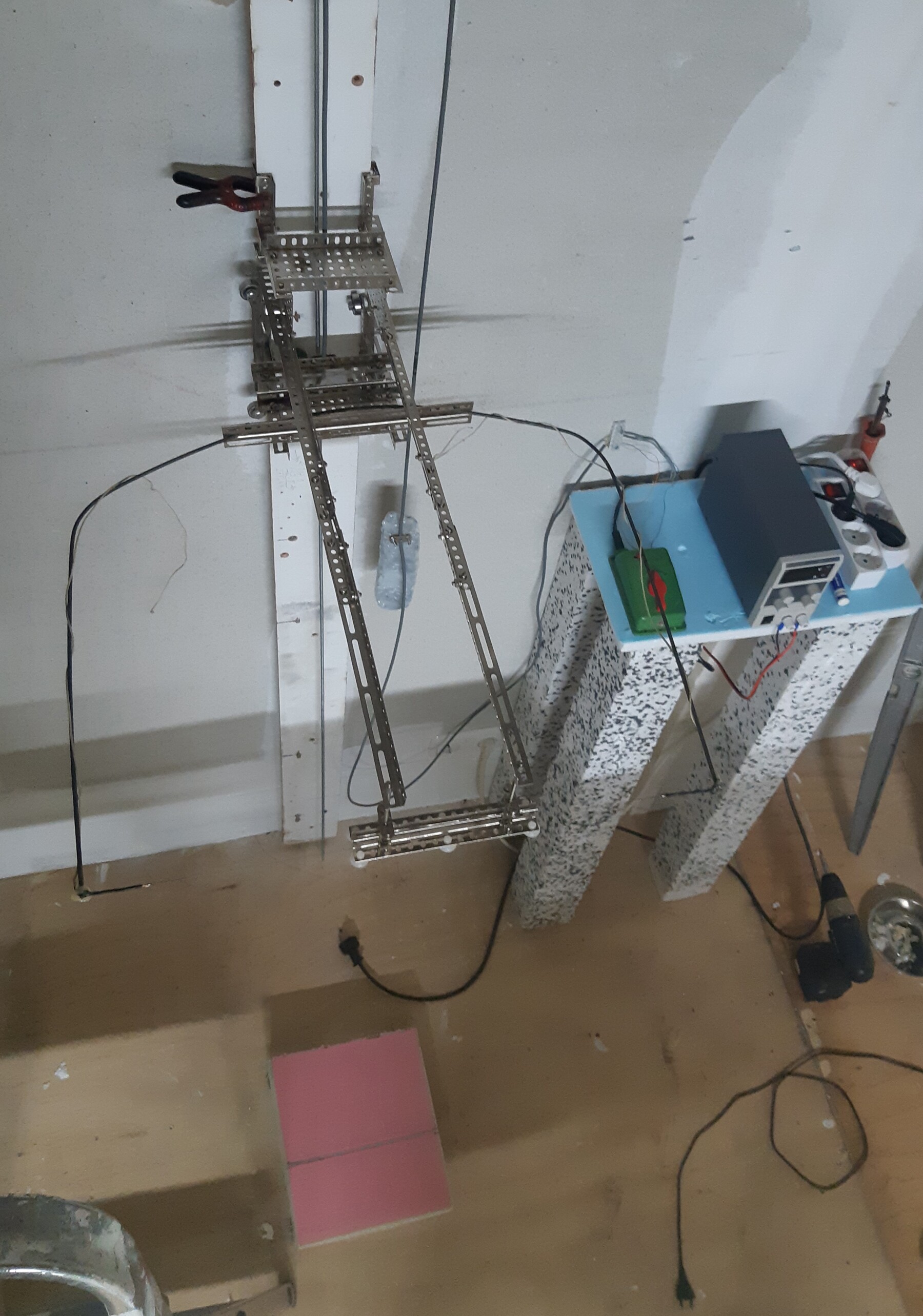 De foto is genomen nadat de draad gesmolten was. De beugel is een stuk gebogen verenstaal, in C vorm gebogen en tussen de uiteinden de gespannen draad. Toen de draad knapte, sprong de beugel open en de rechterkant klapte tegen de gespikkelde poot van het tafeltje waardoor die brak. De poot was makkelijk te lijmen, ik heb een nieuwe draad gespannen aan de uiteinden van de beugel. Voor de zekerheid heb ik tijdens een stuk draad om de uiteinden geknoopt. Die zie je op deze foto. Op de uitersten zie je twee zwarte stukjes geïsoleerd koperdraad met lus, waartussen de warmtedraad geknoopt is.