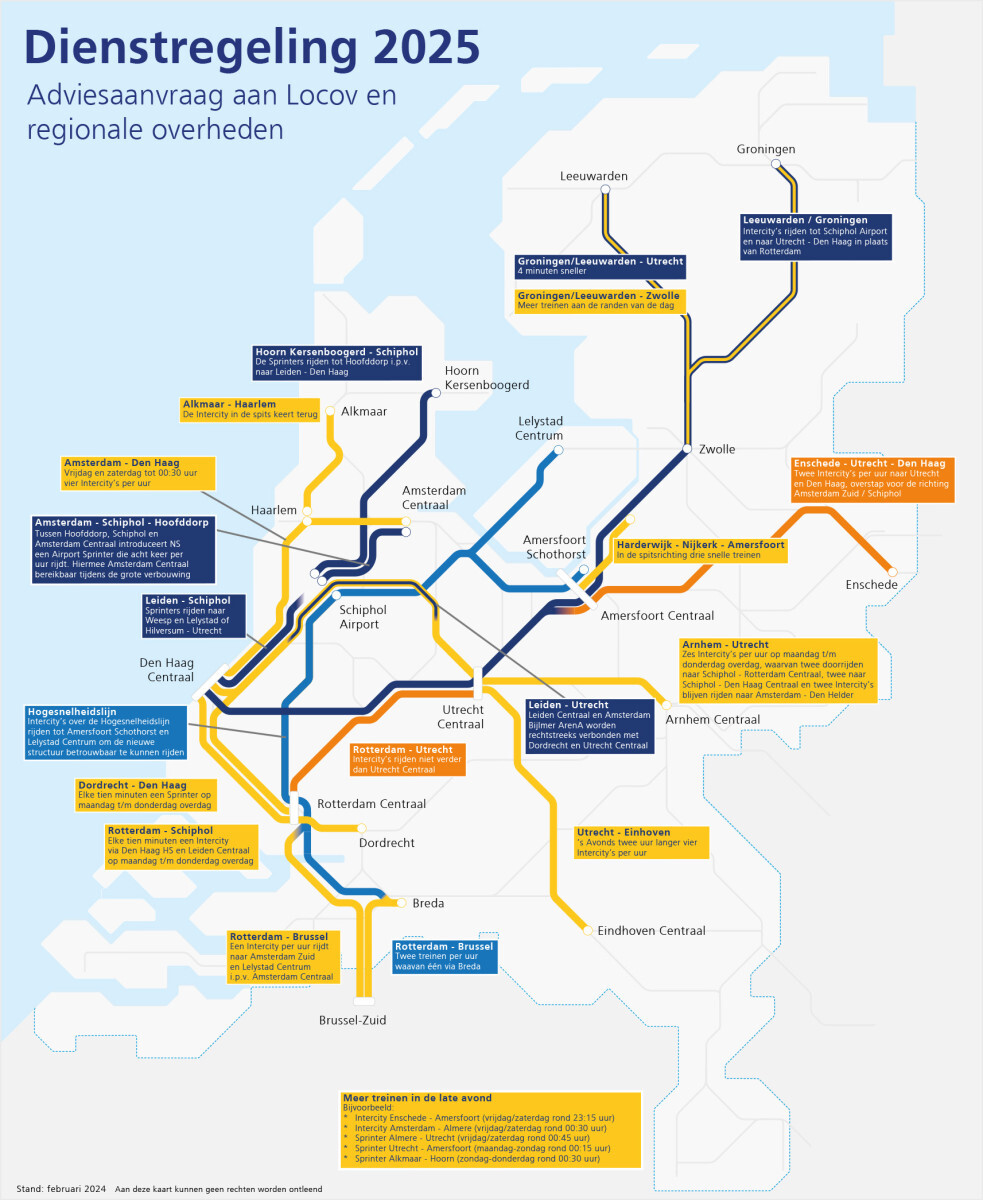 Vandaag was via diverse media te lezen dat de NS haar dienstregeling voor 2025 behoorlijk gaat omgooien. Er zouden heel met meer treinen dagelijks gaan rijden. Bij de berichtgeving is ook een kaartje toegevoegd.