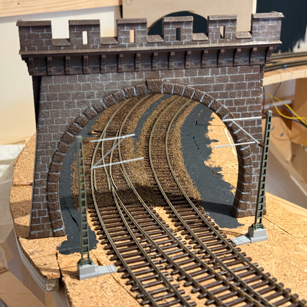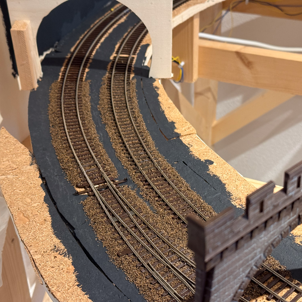 De eerste ballast ligt er, in de tunnel waar ik later niet meer bij kom. Ben op zich wel tevreden met het uiteindelijke resultaat, alleen ligt net iets slordiger dan voor het lijmen. Had de ballast fijn-nevelig besproeit met water+zeepsop voor het lijmen, maar de steentjes gingen toch wat drijven op sommige plekken. Nou ja, het is goed zo.