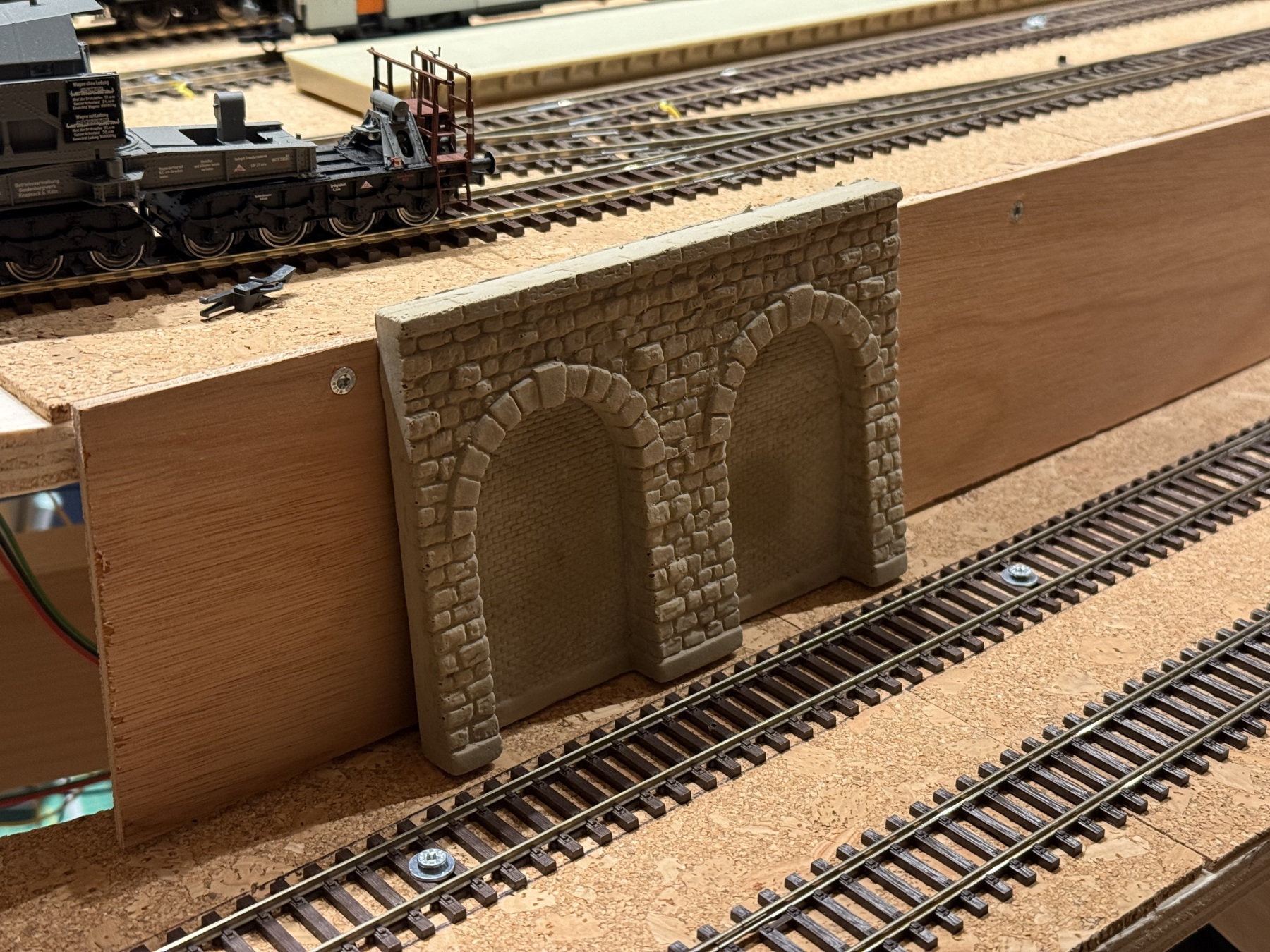De eerste ballast ligt er, in de tunnel waar ik later niet meer bij kom. Ben op zich wel tevreden met het uiteindelijke resultaat, alleen ligt net iets slordiger dan voor het lijmen. Had de ballast fijn-nevelig besproeit met water+zeepsop voor het lijmen, maar de steentjes gingen toch wat drijven op sommige plekken. Nou ja, het is goed zo.