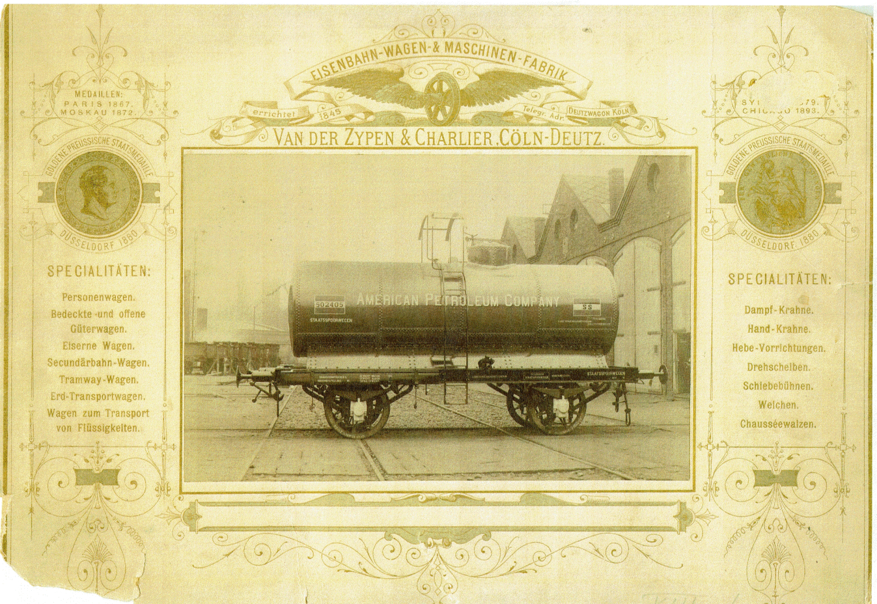 Op de oudste zw/w-foto's zie je donkere ketels (teerwagens) met een witte beschrifting op de ketel