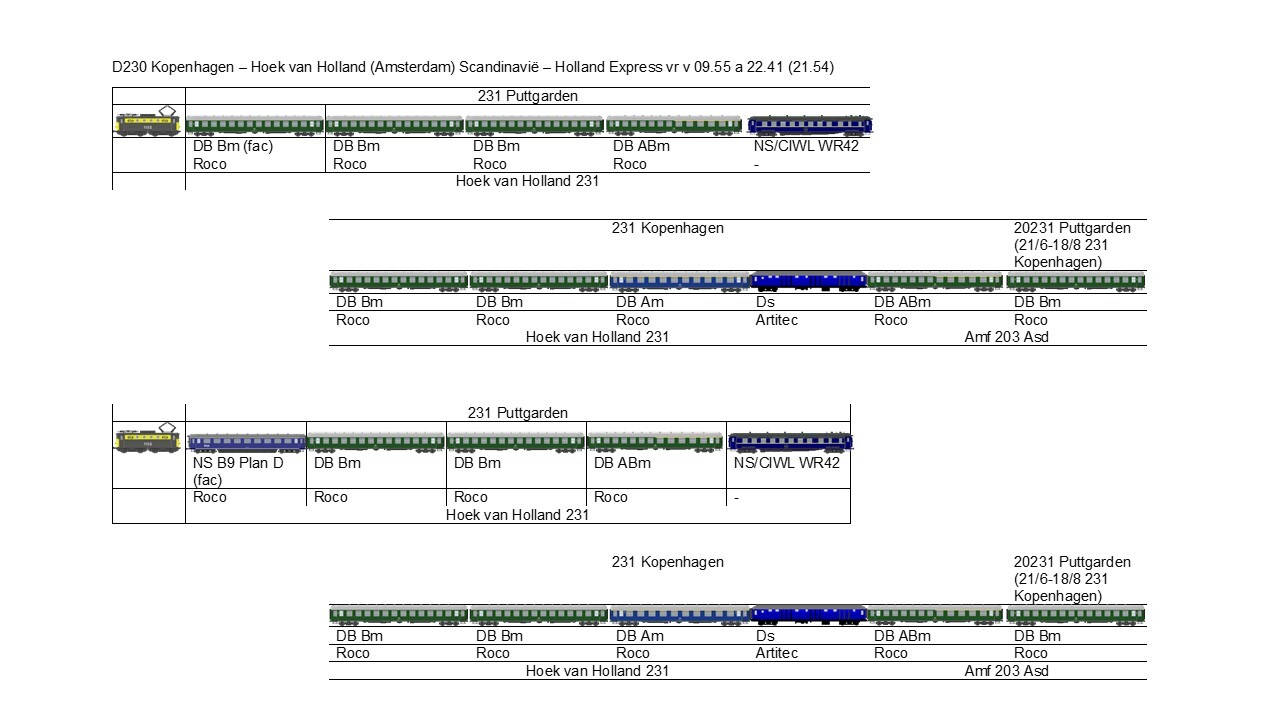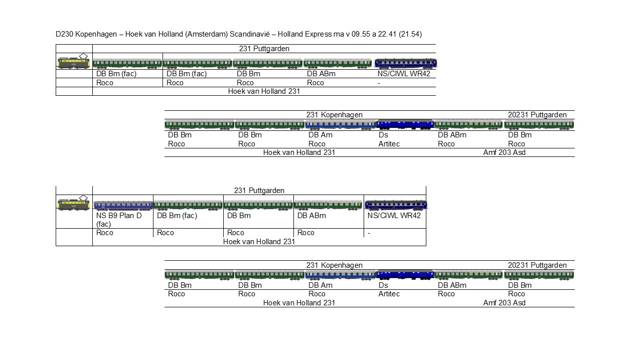 Het DB-bagagerijtuig is een verhaal apart. Dat was er doorgaans eentje zonder kansel (het uitzichttorentje bovenop het rijtuig tbv de conducteur dat in die tijd nog veel voorkwam bij mn oudere Duitse bagagerijtuigen). Ik heb daarover met diverse forumleden van gedachten gewisseld en veel foto's bekeken. Daaruit blijkt dat het niet eenduidig is vast te stellen welk bagagerijtuig daarvoor nu werd gebruikt. Eigenlijk blijkt uit het fotomateriaal dat ik gezien heb dat er niet één specifiek rijtuig werd gebruikt, maar dat er in de pool D's van verschillende pluimage werden gebruikt, alle zonder kansel. Op een enkele foto is ook een bagagerijtuig te zien mèt, maar dat lijkt niet de regel. Voor een realistische samenstelling op onze modelbaan zouden we dus redelijk vrij kunnen opereren zou je zeggen. In aanmerking komen ten minste een Dye 937 (Roco 44593), Düe 938 (Liliput L328901 of 28900), Düe 941 (mèt kansel gemaakt door Fleischmann: 867508) of Dye 973 (Jouef HJ4094). Voor alle genoemde modellen blijkt dat deze nieuw niet meer verkrijgbaar zijn en als occasion zeer zelden worden aangeboden. Een goede oplossing zou kunnen zijn het verbouwen van een goed verkrijgbare Roco 44556, model van een bagagewagen mèt kansel, zoals getoond in Ermehuizen.