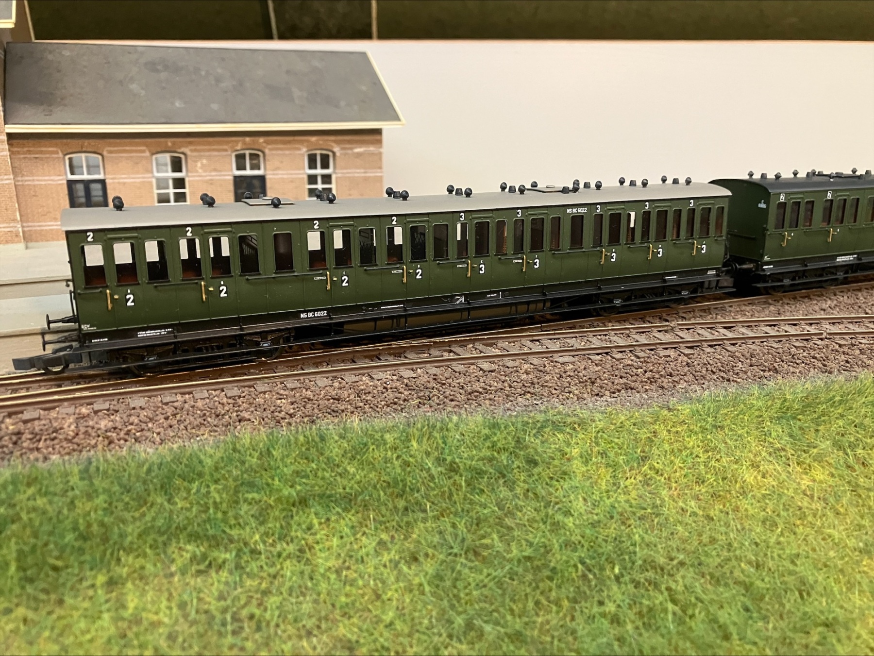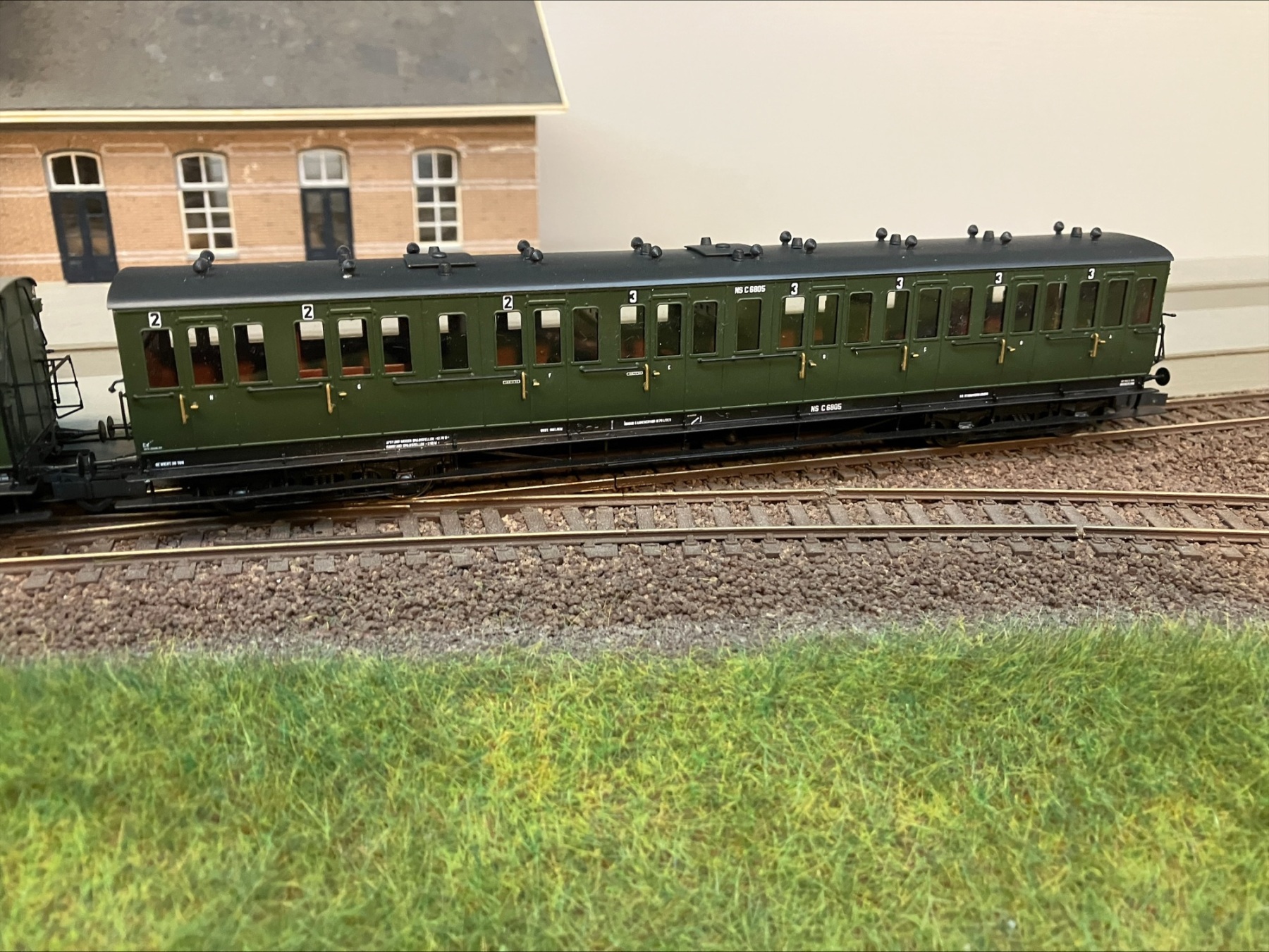 Vragen, vragen.De C 6805 (stond trouwens verkeerd in de titel) is als 2e/3e klasser uitgevoerd kwam in dienst als 1e/2e klasser maar is in 1934 naar geheel 2e klasse en in 1939 naar geheel 3e klas veranderd.Na de oorlog omgenummerd naar 2e / 3e klas maar nog met nummer C8605.Ik zie op de foto banken met hoofdsteunen en dus volgens mij geen houten banken maar nu is de vraag of de oorspronkelijke 1e/2e klasse banken altijd behouden zijn of dat deze in 1934 volledig met 2e klasse banken is ingericht?Dus banken rood en groen of allemaal groen, ik neig naar allemaal groen.(uitsnede foto N.J. van Wijck Jurriaanse boek De Erfenis)