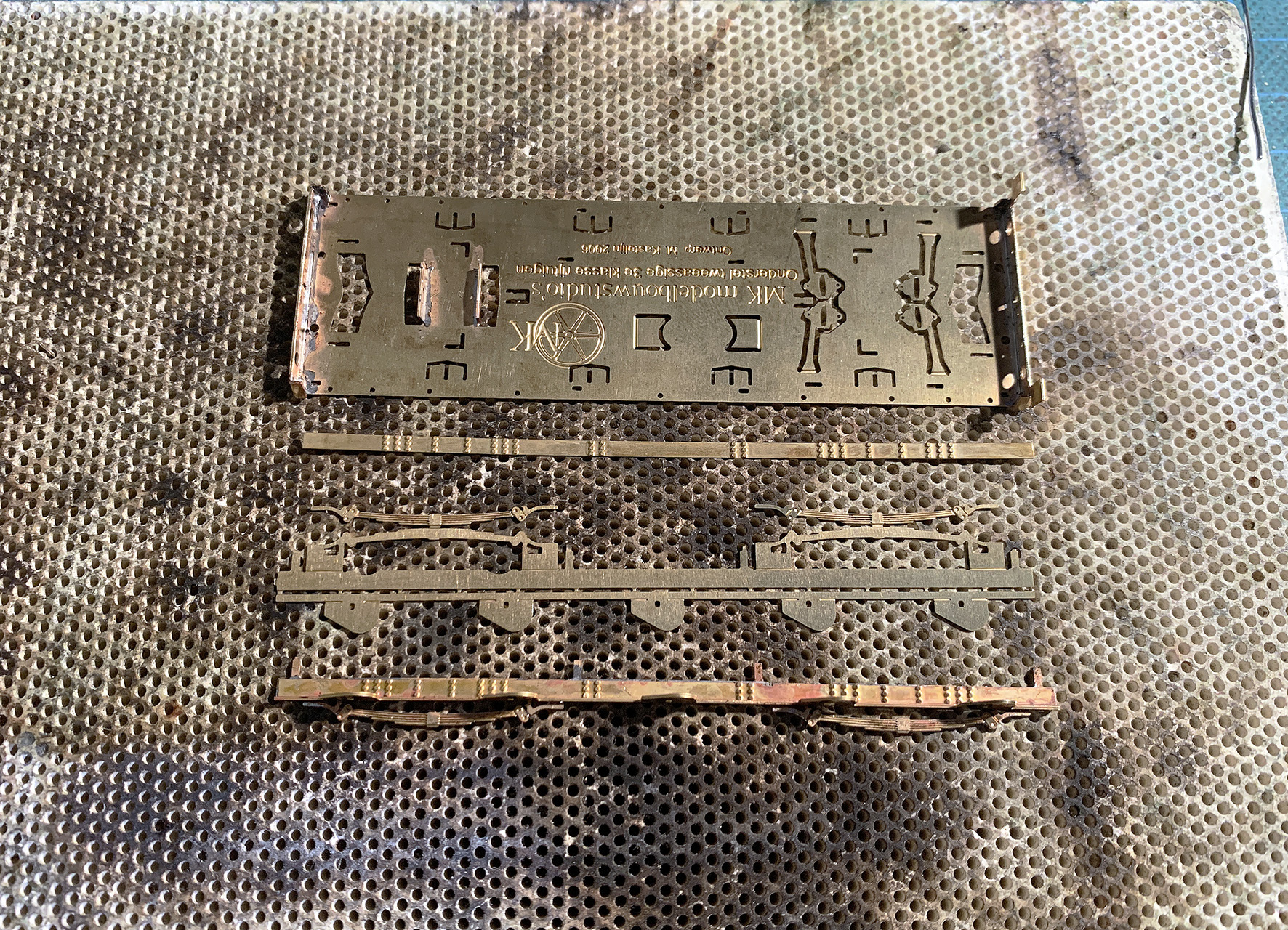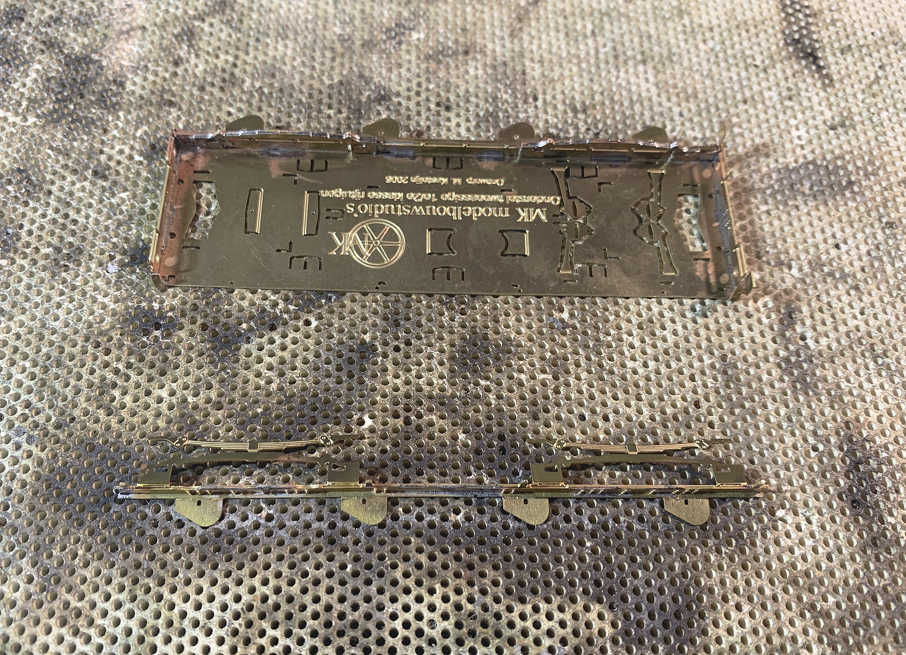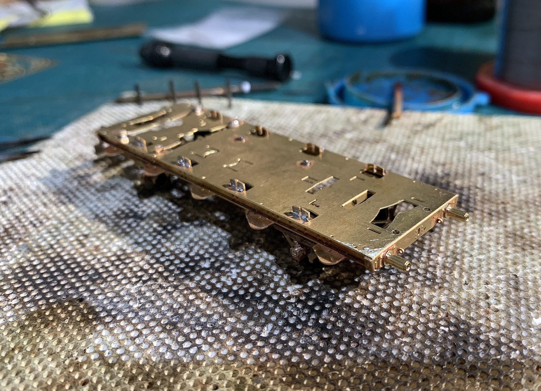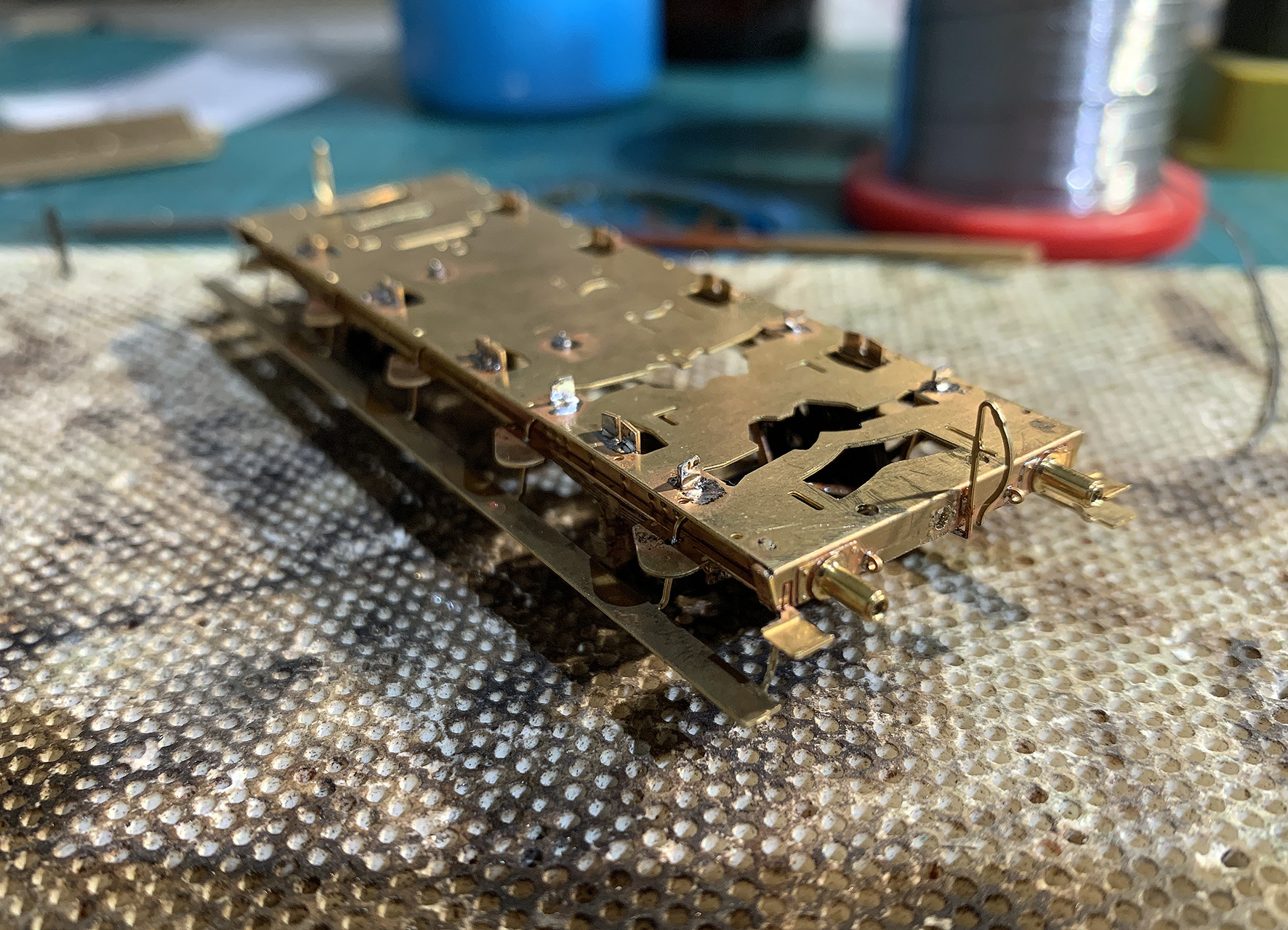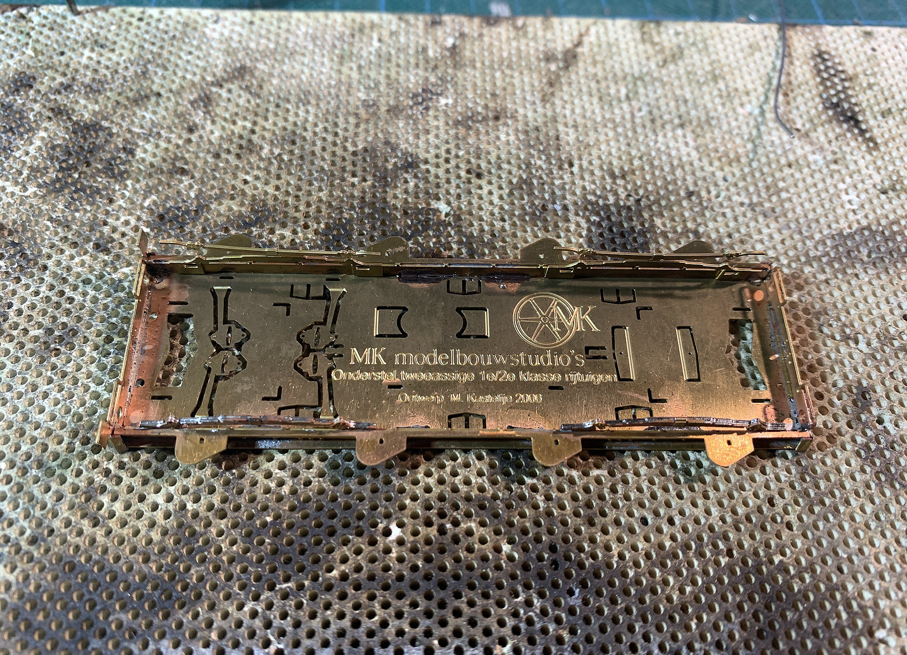 Na wat soldeer- en vouwwerk heb je dan al snel een volwaardig onderstel. 1 stel scheenplaten is scharnierend gemonteerd zodat er een driepuntsoplegging ontstaat. Het is een mooi idee, maar in het geval van deze onderstellen werkt het net niet lekker. De toleranties zijn te klein waardoor de as haast geen ruimte heeft om te kantelen. Bovendien zit er een minimale afwijking in hoogte tussen de vaste assen en de kantelassen. Maar dit valt gelukkig niet zo heel erg op. Ik zag dat pas nadat alles gespoten en gemonteerd was door een verschil in bufferhoogte.