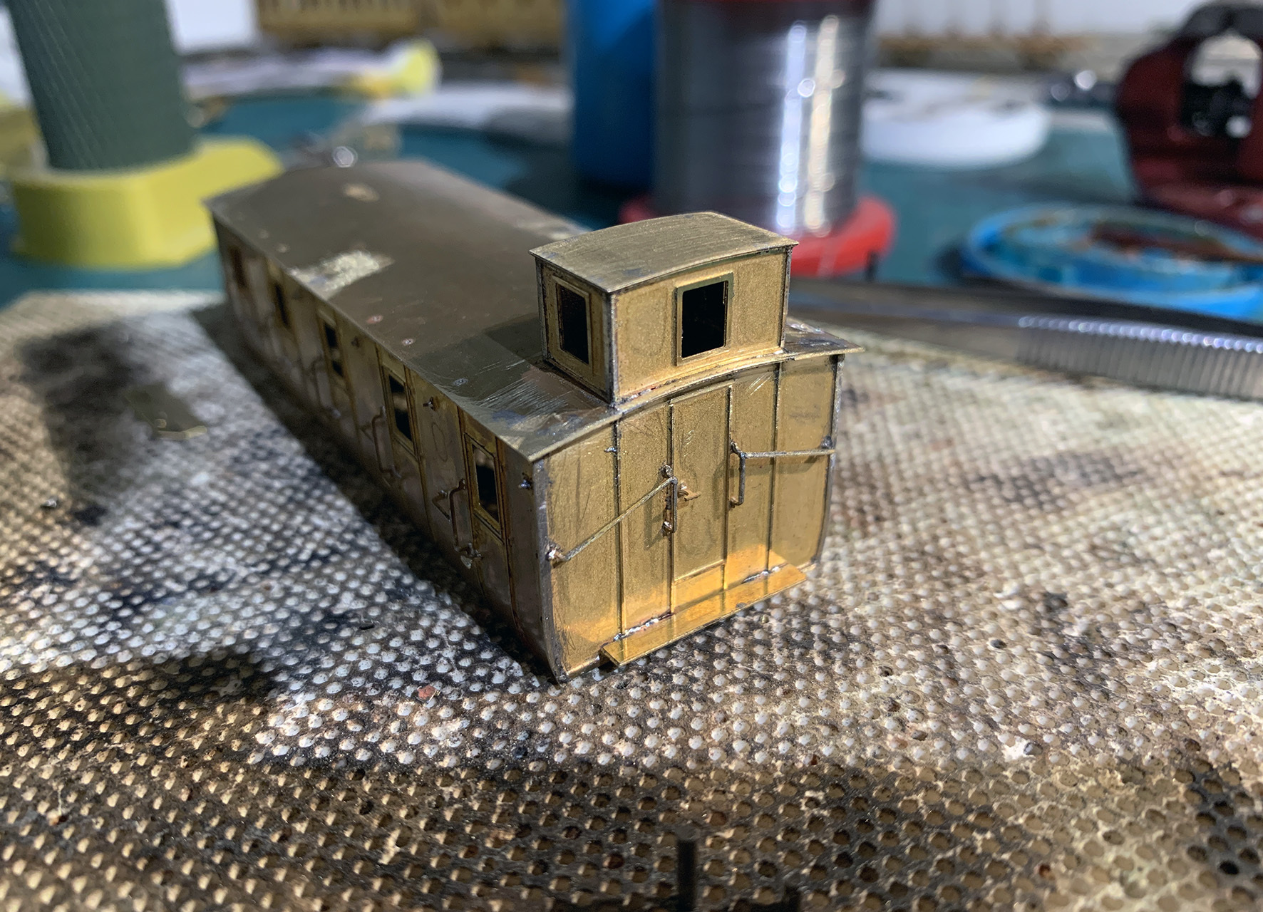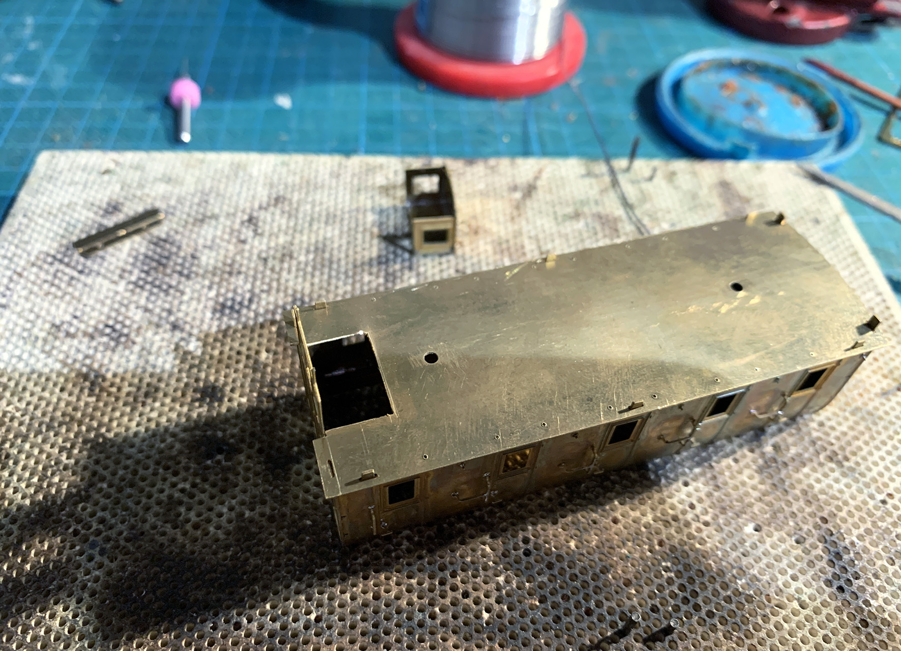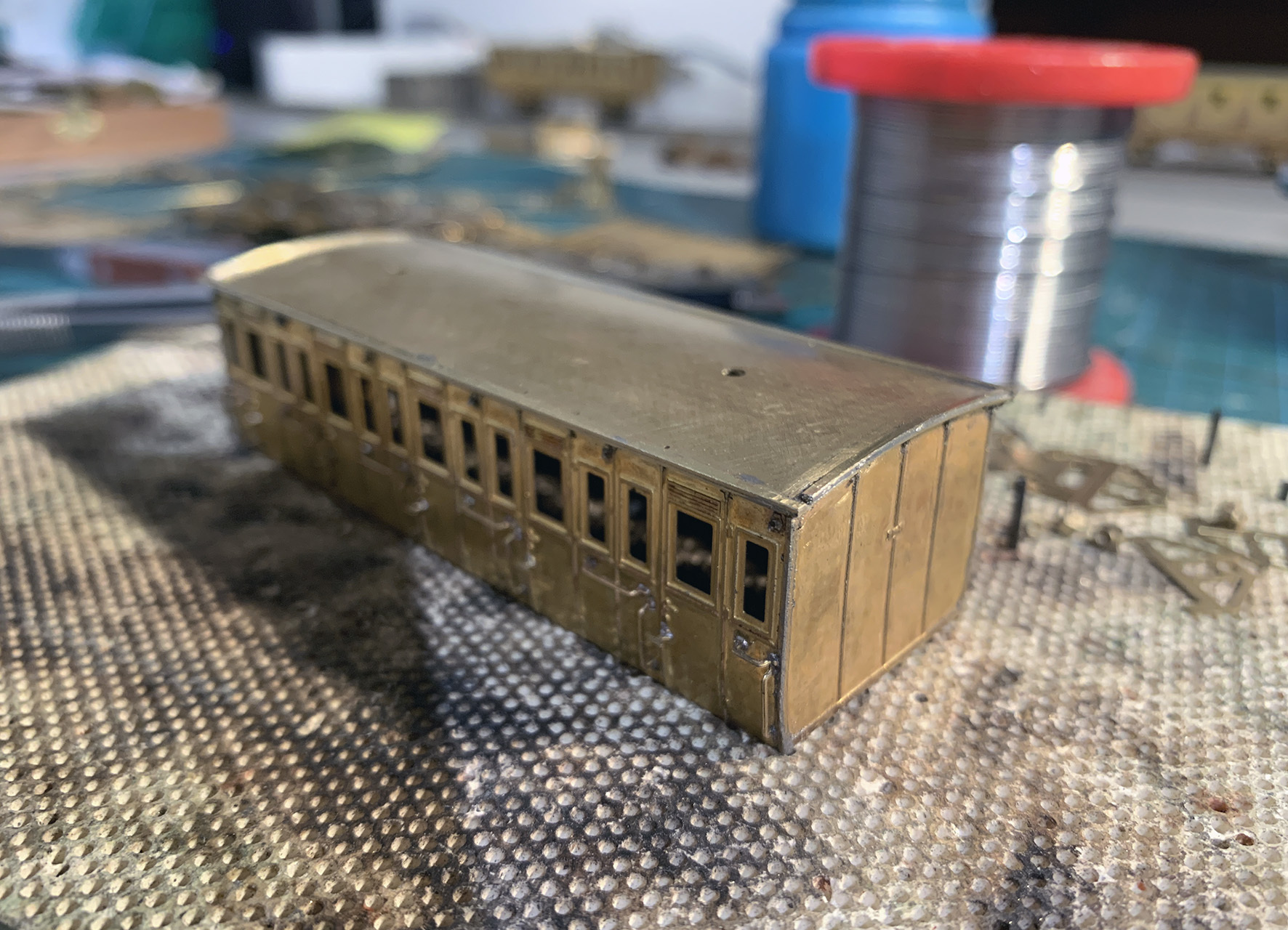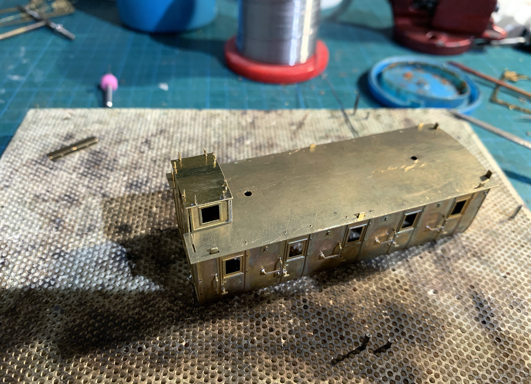 Het verhaal gaat weer verder. Dit keer over de kap. De kap zit eenvoudig in elkaar met vier losse wanden en een dak. De wanden kan je - nadat je de zijwanden hebt gebogen - het beste als eerste van alle details voorzien en daarna alle vier haaks op elkaar solderen. Zo ontstaat er al snel een wagenbak. Het dak is deze keer niet voorgevormd, maar dat is met een platenwals snel gepiept. Ik gebruik daarbij een nieuw trucje. In eerste instantie rolde ik mijn messing platen altijd los door de wals, maar het begin en het einde van de ronding was daardoor niet altijd even strak. Tegenwoordig geleid ik de messing plaat op een stuk dik papier, waardoor de ronding er al eerder ingedrukt wordt. Het dak krijgt daardoor een betere vorm. Ik zag dit op een van de filmpjes die FritsT wel eens gedeeld heeft.