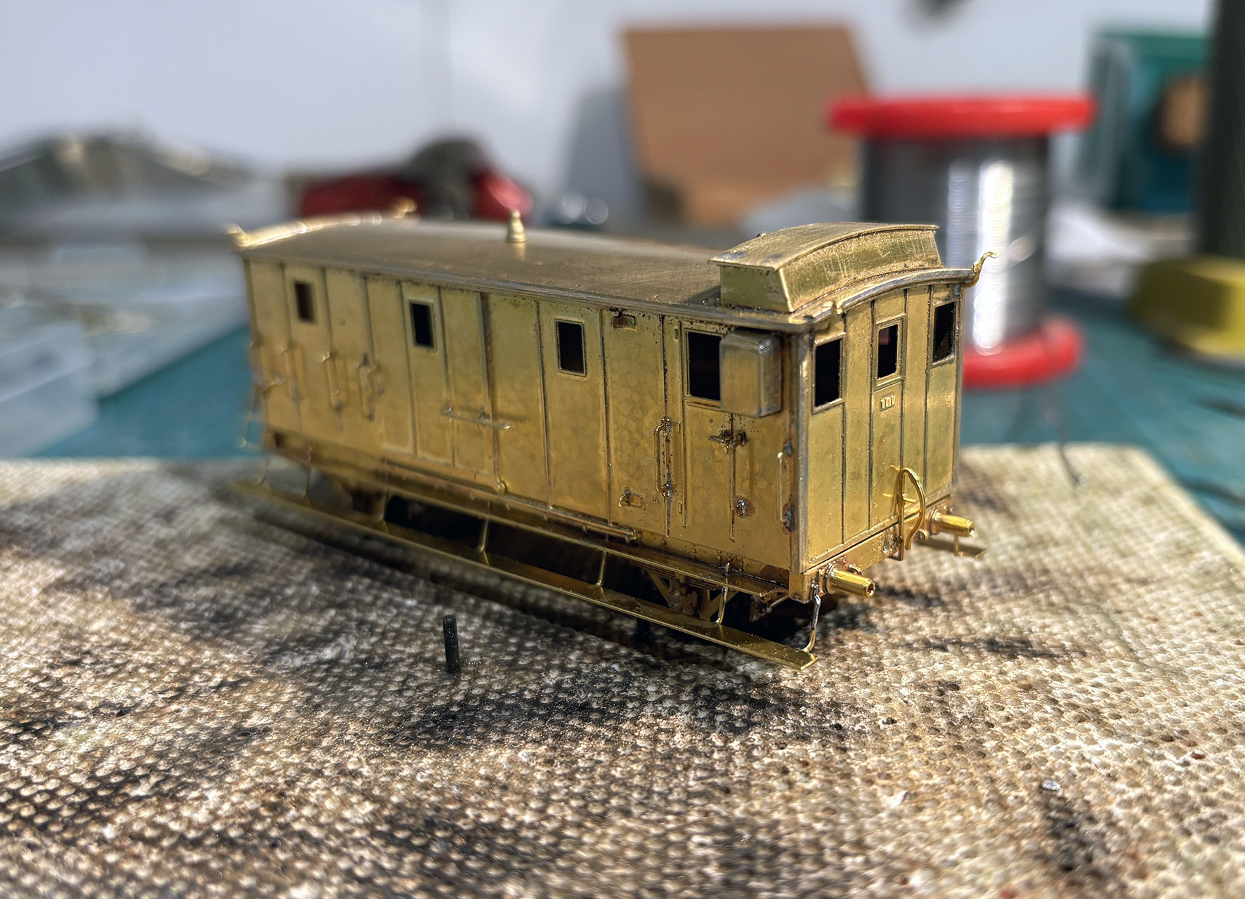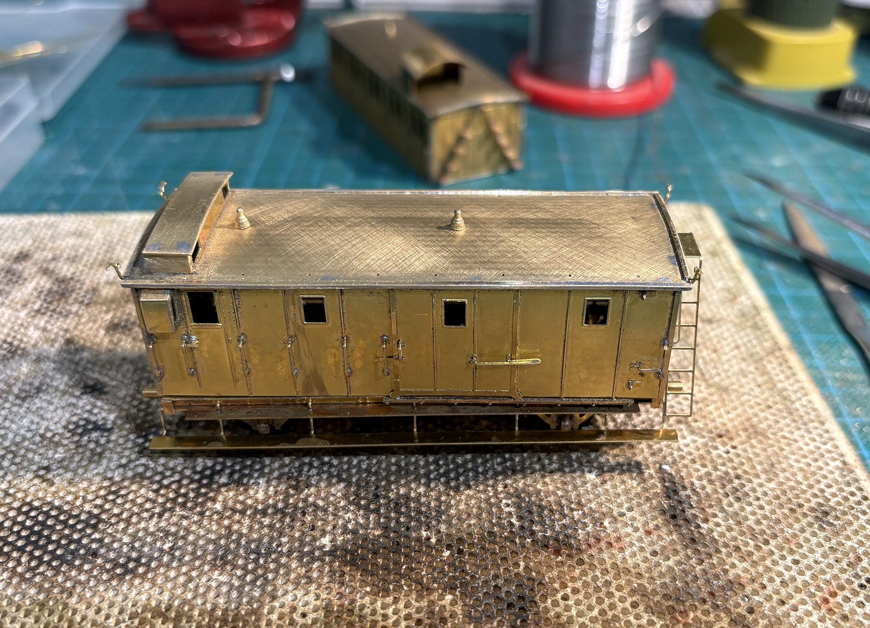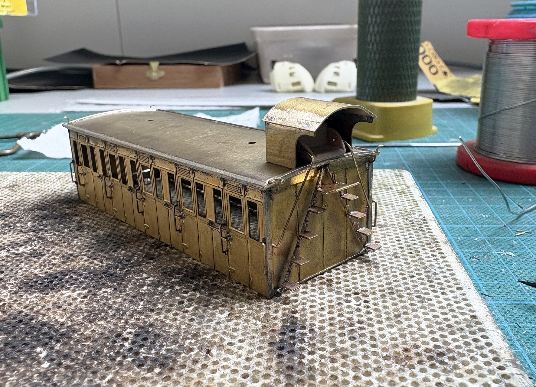 Het verhaal gaat weer verder. Dit keer over de kap. De kap zit eenvoudig in elkaar met vier losse wanden en een dak. De wanden kan je - nadat je de zijwanden hebt gebogen - het beste als eerste van alle details voorzien en daarna alle vier haaks op elkaar solderen. Zo ontstaat er al snel een wagenbak. Het dak is deze keer niet voorgevormd, maar dat is met een platenwals snel gepiept. Ik gebruik daarbij een nieuw trucje. In eerste instantie rolde ik mijn messing platen altijd los door de wals, maar het begin en het einde van de ronding was daardoor niet altijd even strak. Tegenwoordig geleid ik de messing plaat op een stuk dik papier, waardoor de ronding er al eerder ingedrukt wordt. Het dak krijgt daardoor een betere vorm. Ik zag dit op een van de filmpjes die FritsT wel eens gedeeld heeft.