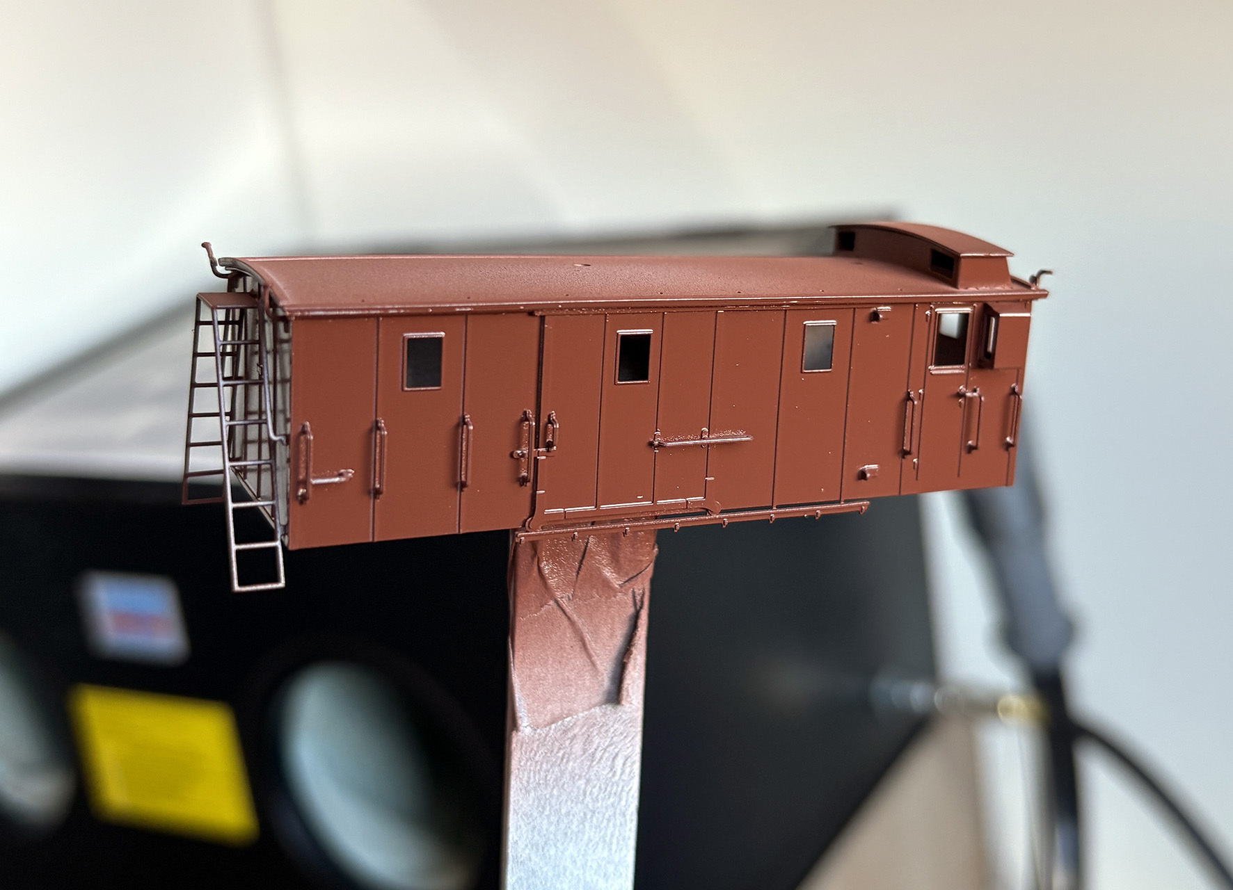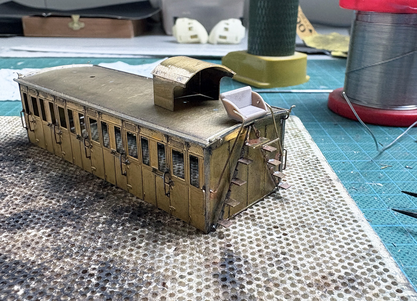 Dan is er ook nog een rijtuig met remmersstoel in plaats van remmershuis. Boven de stoel zit een afdakje. In eerste instantie ontbrak de stoel en de trap terwijl het afdakje wel bij de etsplaat zat. Een mailtje naar Maykel zorgde ervoor dat ik verleden jaar in Houten een etsplaatje en een stoeltje kon ophalen. Het leuke is dat het stoeltje tegenwoordig een 3D geprint onderdeel is in plaats van een platte ets. Dit geeft een veel mooiere vorm aan de stoel. Tijdens de bouw heb ik de stoel met wat dubbelzijdig tape op het dak vastgezet en heb ik de trap en leuningen op maat gemaakt. Daarna is de stoel en het afdakje apart gespoten en op het laatst erop gelijmd. Afplakken was nu al een behoorlijke uitdaging en ik weet niet hoe ik dat had moeten doen als deze onderdelen er ook nog op hadden gezeten.
