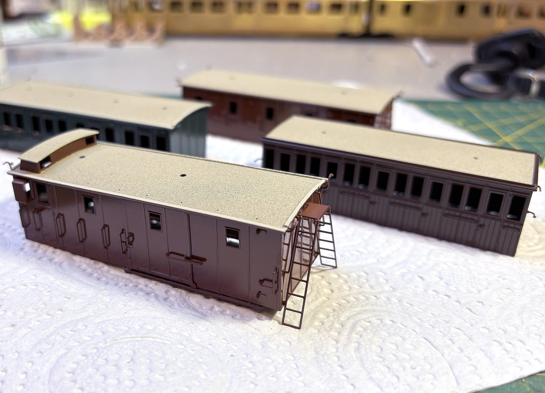 De kleuren wijken iets af van de HSM rijtuigen. Het bronsgroen is dezelfde kleur (RAL 6012), maar het bruin is heel anders. De ouderwetse kleuren worden nu geïnterpreteerd met een RAL kleurnummer. Het roodbruin van de HSM is RAL 8017. De Staatsspoor kleur roodbruin is volgens Maykel RAL 8015 en dat is behoorlijk lichter van kleur. Ik vind het een zeer fraaie kleur. Waar ik eerder alle kappen met Duplicolor spuitbussen had gespoten was dat nu niet mogelijk. RAL8015 is in spuitbus van het merk Duplicolor niet te koop. Daarom heb ik de kappen met de nitro verf van MKmodelbouwstudio's gespoten. Dat was even wennen, want het spuit anders dan de nitro lakken van Phildie. Na wat spelen met druk en mengverhouding ging het goed. Ik merk dat deze lak iets meer druk wilt en iets meer verdunning, ongeveer 1:1,5 en 2,0 bar met een 0,3mm nozzle. Daarnaast op kleine afstand spuiten omdat de lak in de lucht al snel droogt. Dan vloeit het niet meer.