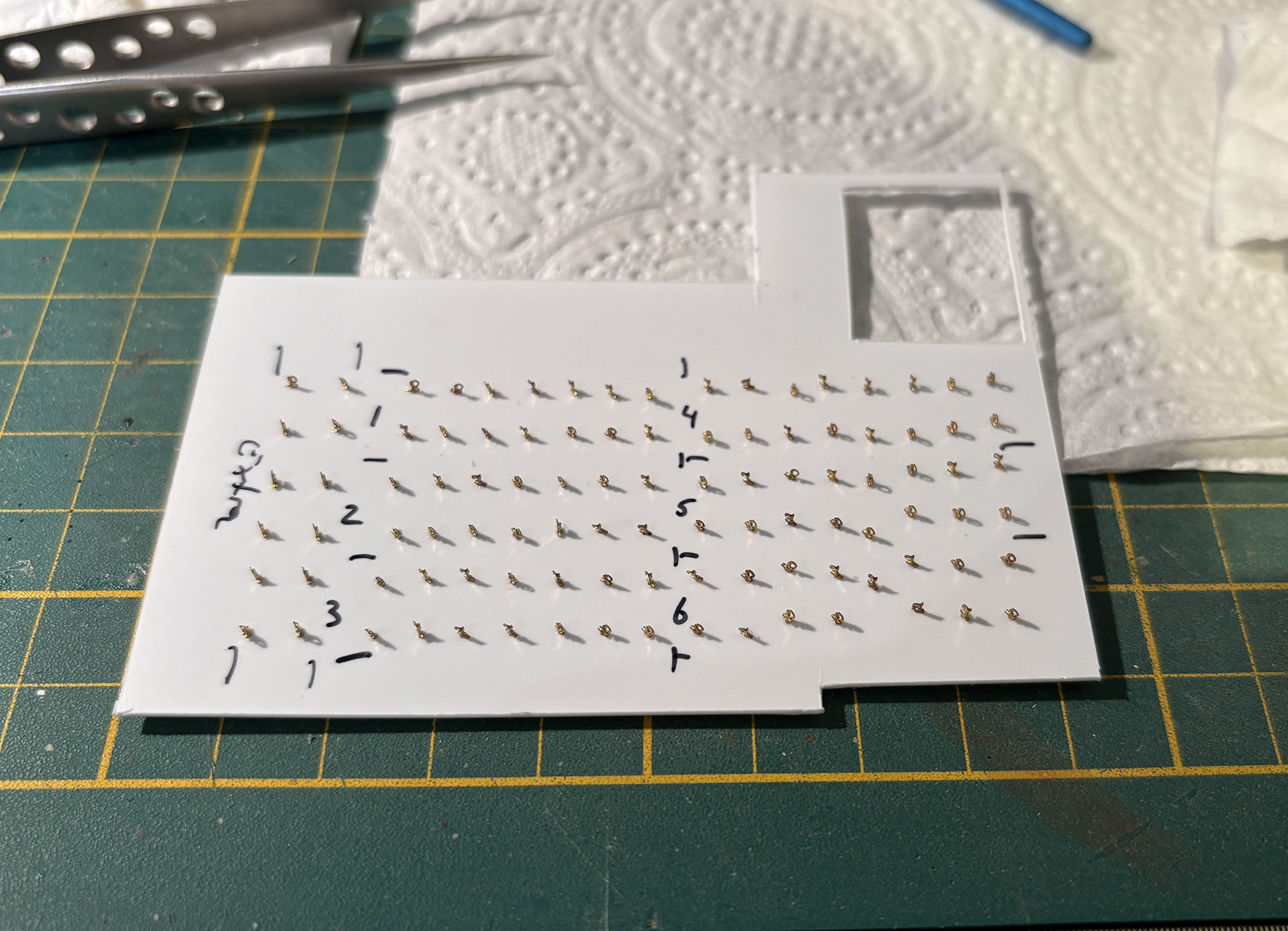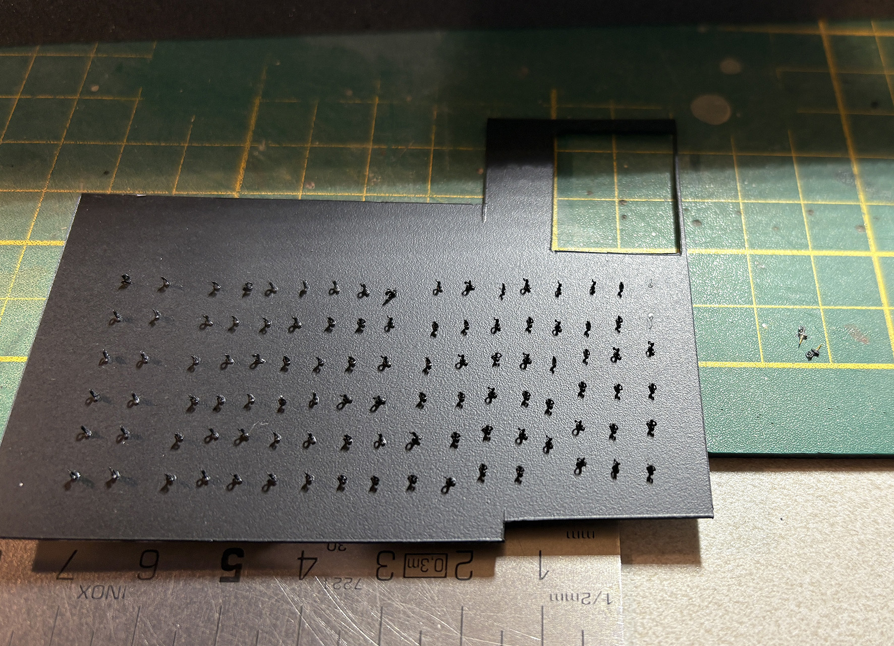 Ik vergat nog wat te schrijven over de oogjes voor het trekkoord. Op het dak komen zwarte oogjes. Die heb ik er ook achteraf op gelijmd omdat ik deze niet vol wilde laten lopen met verf en 'zand'. Op een plaatje styreen heb ik 98 gaatjes van 0,5mm geboord en daar de oogjes ingestoken. Met zwarte primer kwamen ze op kleur.