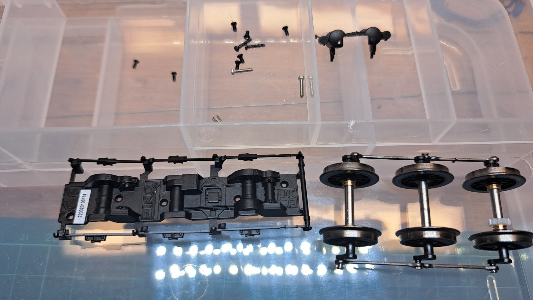 Ik wilde ook het kortkoppelmechaniek verwijderen. Daartoe de lok gedemonteerd. Dat leverde een hoop schroefjes op en vier microveertjes, die gzd allen bewaard zijn gebleven.