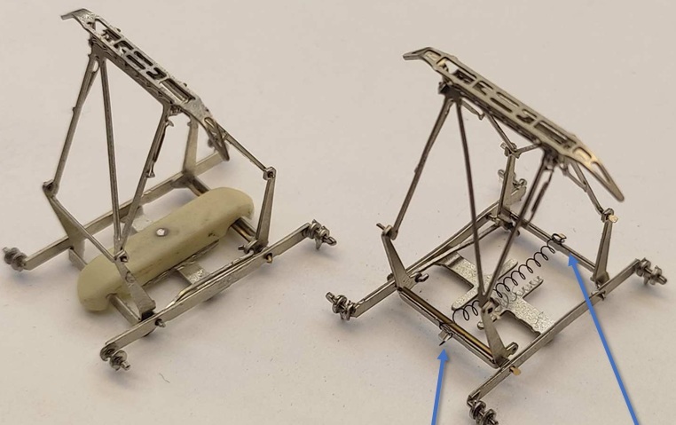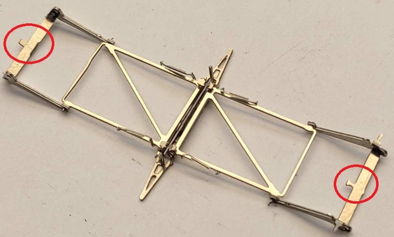 De vorige keer vertelde ik dat ik behoorlijk wat problemen had om het stelletje fatsoenlijk te laten rijden. Ik ga er nu wat nader op in en de maatregelen die ik heb genomen.Op een recht stukje spoor reed het stelletje goed, met alleen gedoe met instellingen van de decoder. B.v. hij begon met een schok te rijden en bij lage snelheid was het schokkend rijden. Kruipen was niet mogelijk. Bij middensnelheid was er mee te rijden en kon ik zien of het stel een rondje wou rijden. Helaas was deze hoop ijdel en ontsporingen was bij elke wissel en bochten. Ook de trekkracht was niet bijzonder met veel wielslip in de bochten. en teleurstelling.Dan kan je twee dingen doen, of het wordt een vitrinedame of je gaat proberen er wat van te maken. Ik heb voor het laatste gekozen.Het eerste wat ik heb aangepast is onder de draaistelzijkanten zit een blokje. Ik heb dit met geel aangeduid.De redenen waarom dit er zit is mij volkomen onbekend maar het zorgt ervoor dat hij bij wissels achter de rails blijft haken, dus die heb ik verwijderd. In het oranje staat de onderkant van de vouw balg. Deze heb ik verwijderd omdat deze de beweging van de draaistellen belemmerd. Hier nog een foto van de draaistellen.In het geel de blokjes die weg moeten. Daar de assen door het grote oplegvlak nogal veel rolweerstand ondervinden heb ik een driepuntsoplegging gemaakt door op de rode strepen een stukje messingdraad te bevestigen. Zo kunnen de wielen beter de oneffenheden, zoals puntstukken, verwerken.Vervolgens zag ik dat de flappen van de vouwbalg in contact kwamen met de zijwand van de andere bak. Deze moeten dus afgerond worden, zie hiervoor de volgende foto.Dan het motordraaistel. De schortplaten en traptrede moeten worden ingekort anders kan het draaistel geen voldoende uitslag maken.Dan wil ik nog de oplegging van het motordraaistel aanpassen want kan wel kantelen maar niet zijdelings. Op de draaistellen foto heb ik een groene aanduiding gegeven waar ik nog wat aan wil prutsen.Een ander ding is het loopdraaistel onder de ABk. Het blijft kritisch bij wissels en heb daarom de RP25 wielen vervangen door NEM wielen.Met deze aanpassingen is er goed mee te rijden, zoals jullie op de filmpjes hebben kunnen zien.Tevreden ben ik nog niet want ik wil de wielen van het motordraaistel ook vervangen door NEM wielen en ga ze alle vier voorzien van een slipbandje. Ook de oplegging moet ik nog aan passen.Dan de decoder nog........ k...dingRob