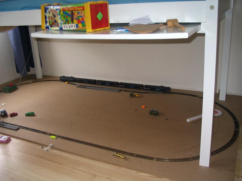 Tip: teken je baanplan op schaal uit (bijvoorbeeld op ruitjespapier). Ik denk dat je er dan achter komt dat je schets wat optimistisch is qua mogelijkheden. Bogen en wissels nemen meer ruimte in beslag dan je denkt.
