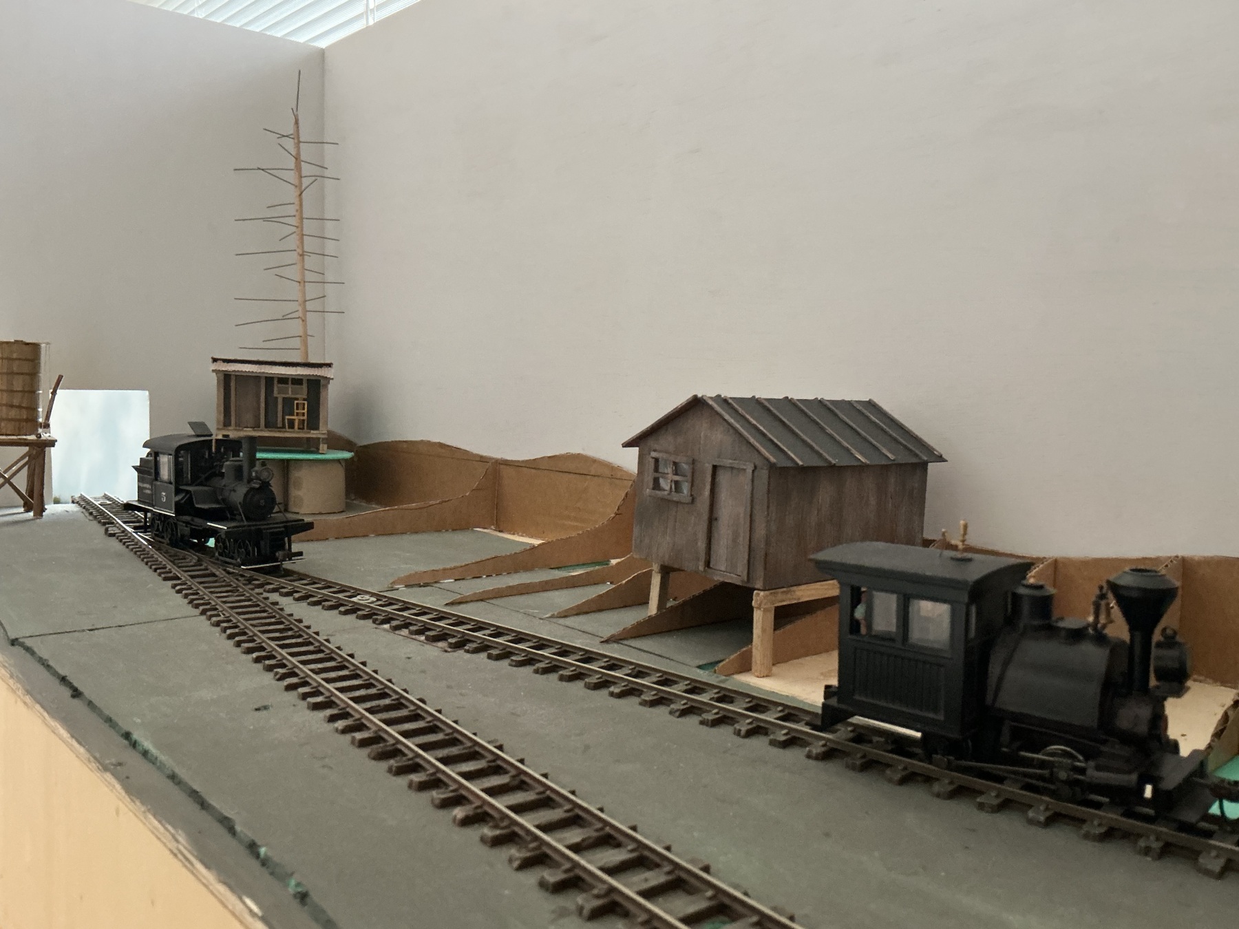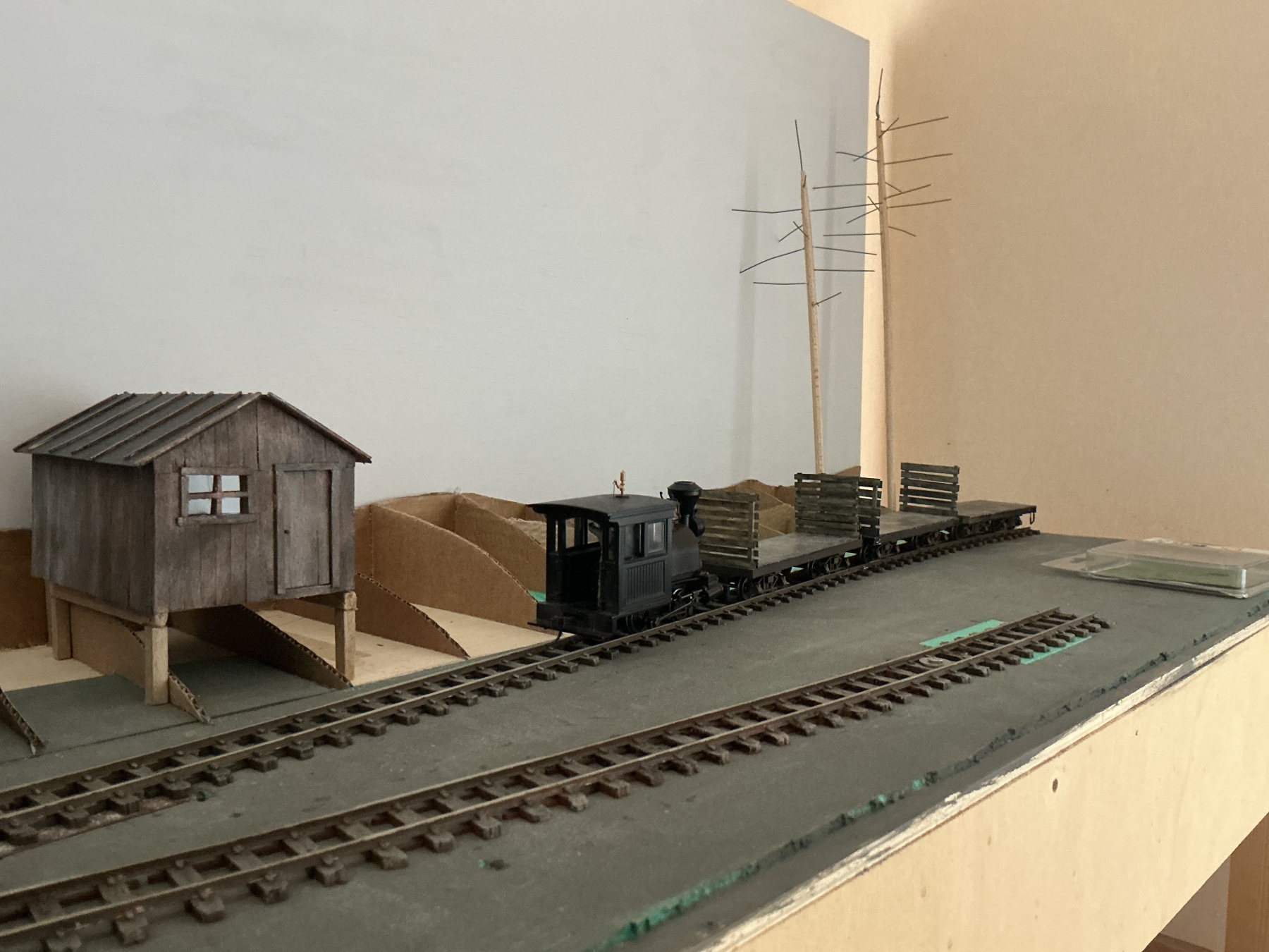 De bunkhouses komen op poten in de helling te staan. Voor de bunkhouses komt een soort steiger (bij gebrek aan beter woord) die de bunkhouses verbind. De skeletten voor een drietal naaldbomen zijn klaar. Nu eerst de contouren voor het landschap afmaken. Na lang wikken en wegen laat ik de rechter zijkant open. Aan de voorkant komt wel een rand voor de verlichting, maar die knutsel ik later in elkaar. Zo kan ik er nu nog makkelijk bij.