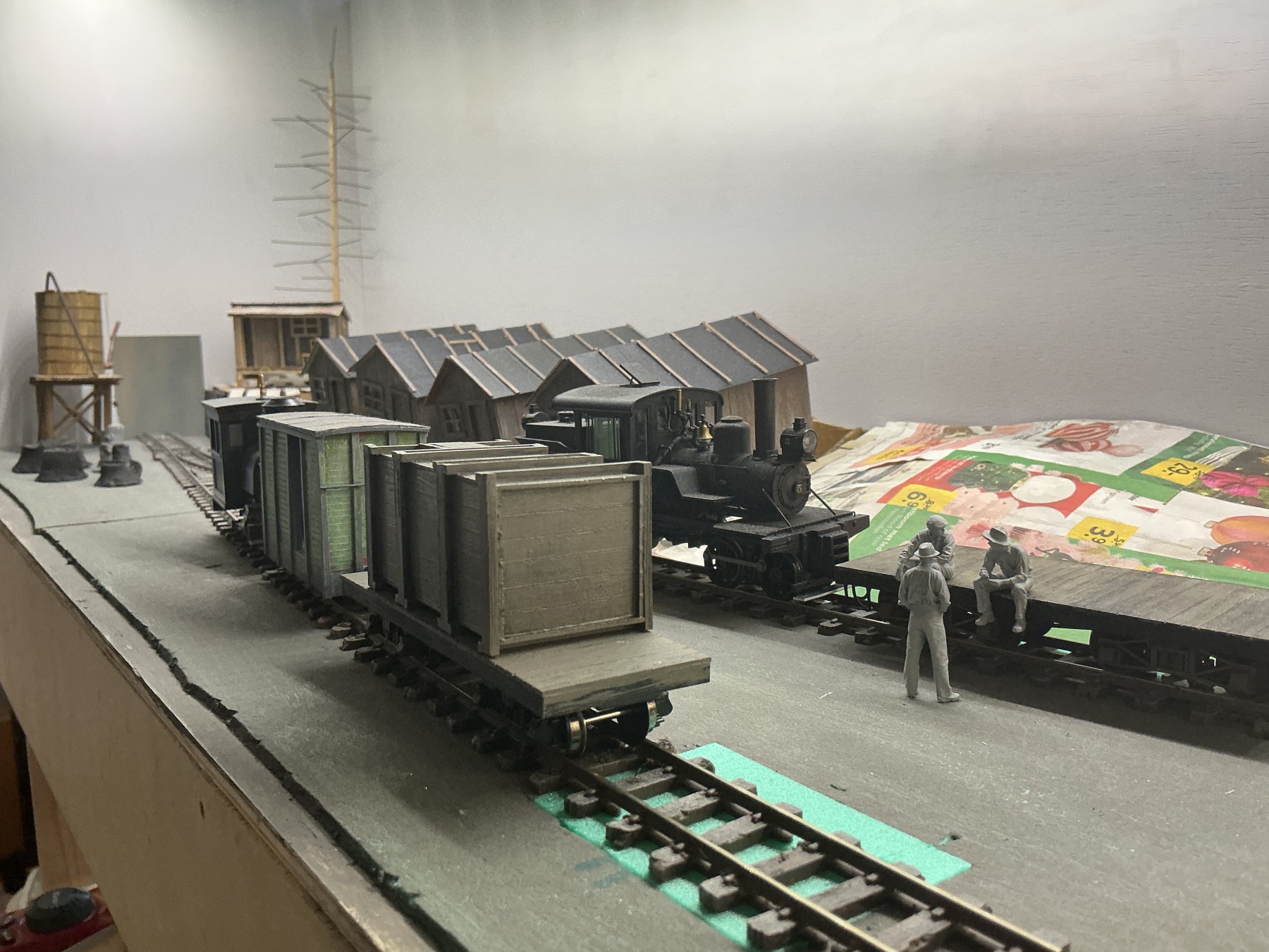 De rails zijn nu aangesloten. Het wissel werkt met mijn gebruikelijke satéprikkeraandrijving. Er kan heen en weer gereden worden. De daken van de bunkhouses zijn nu allemaal af, alleen nog de weathering.