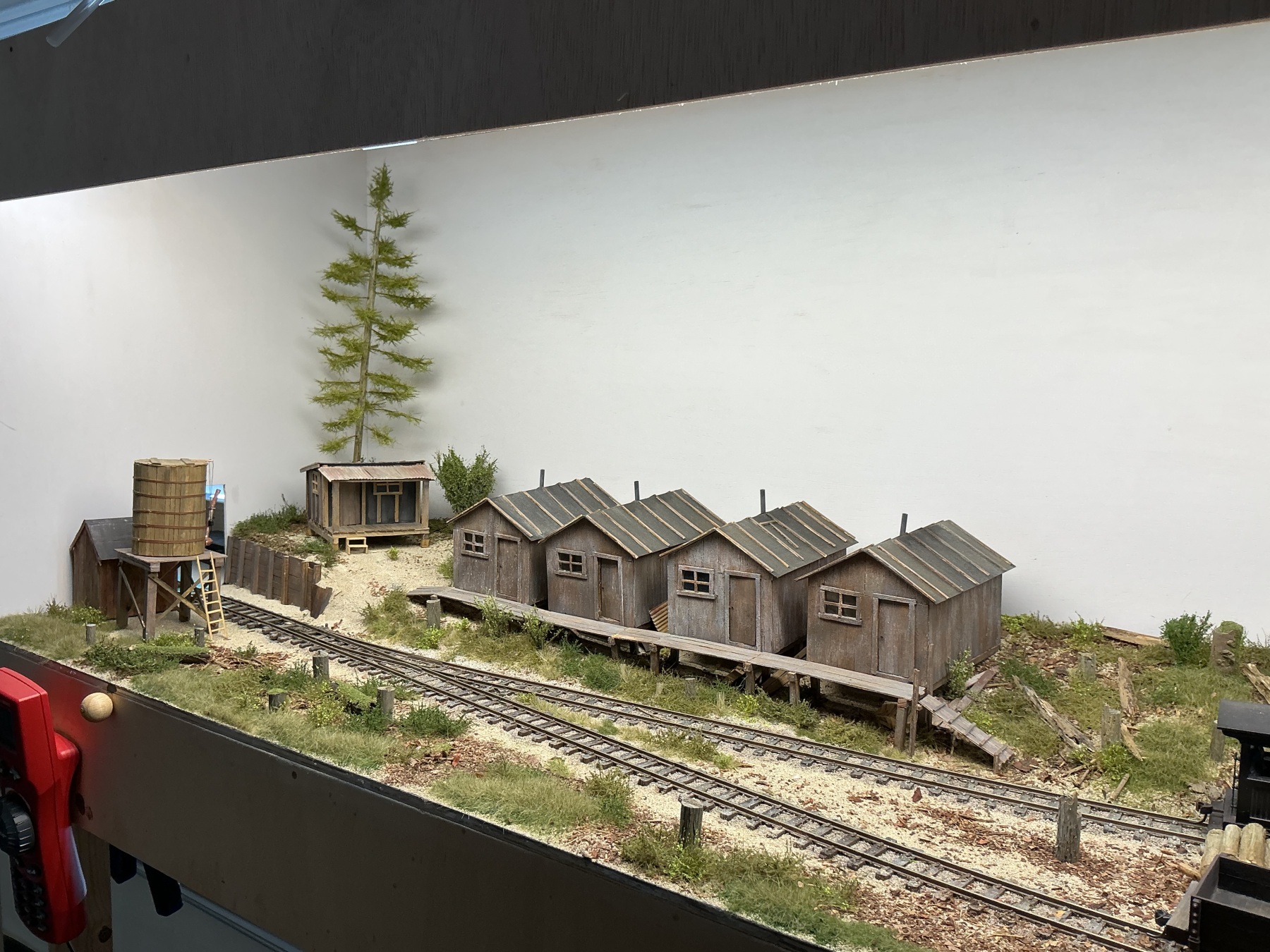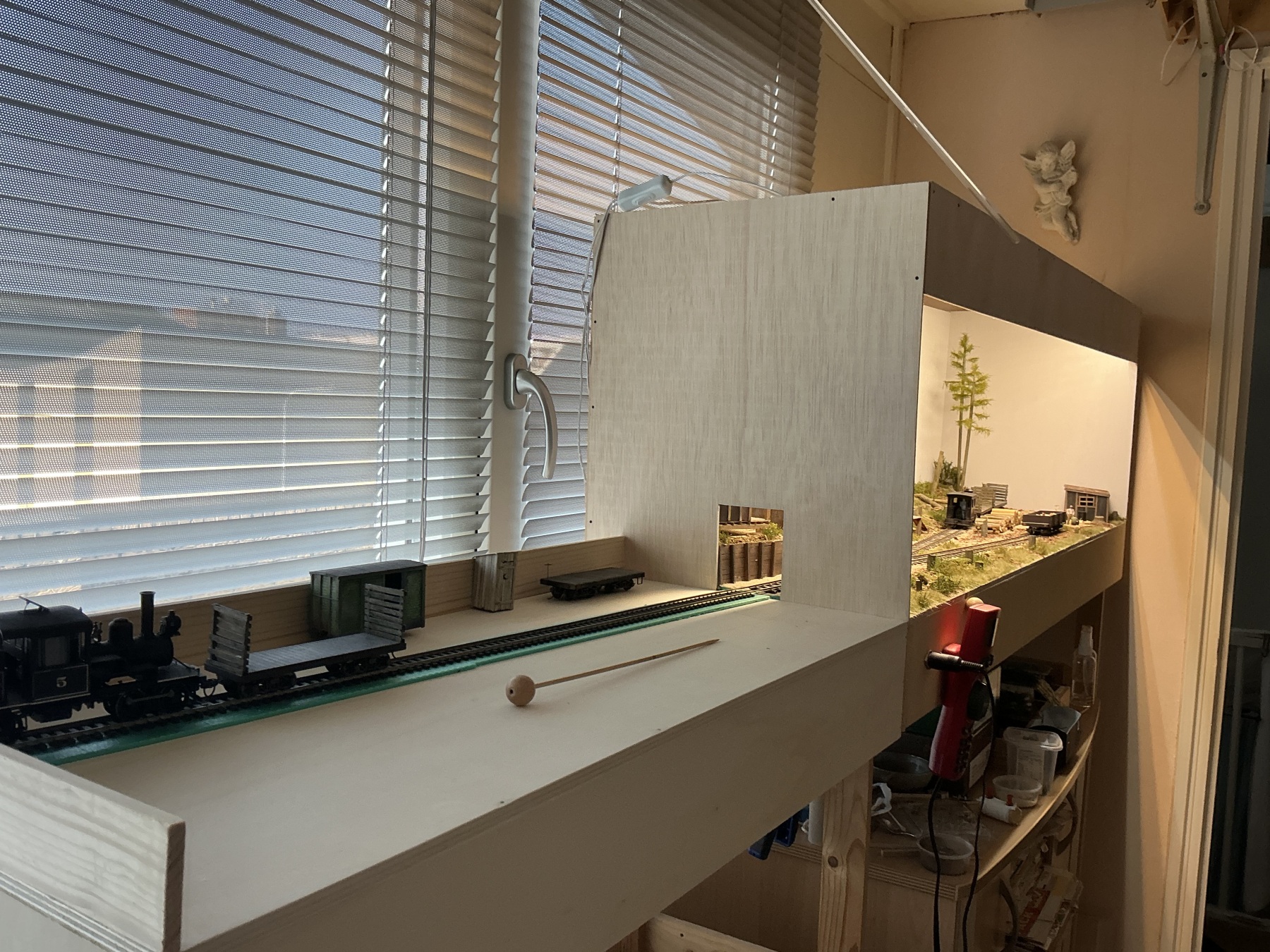 Het is even geleden, maar er is voortgang geboekt. Ondanks drukte op werk en privé heb ik tussen de bedrijven door het nodige kunnen doen. Er is in elk geval een toonbaar baantje, hoewel er nog wel wat klussen zijn. In elk geval is er een “fiddle yard”, hoewel dat een groot woord is voor een enkel spoor. Ik hoop komende week de bak te gaan schilderen, de naam aan te brengen en de snoeren voor de verlichting op orde te brengen. Genoeg gekletst, hier wat plaatjes: