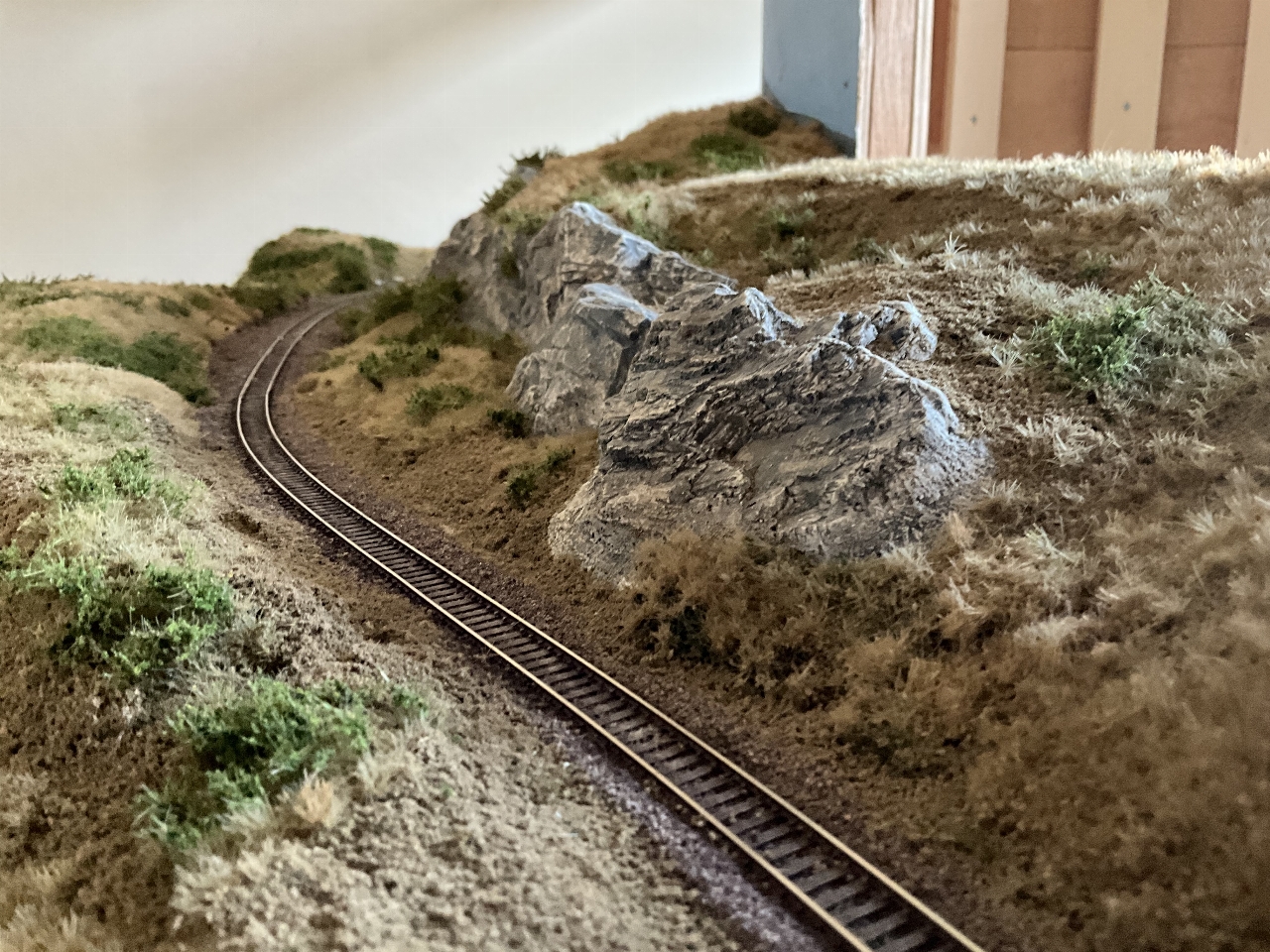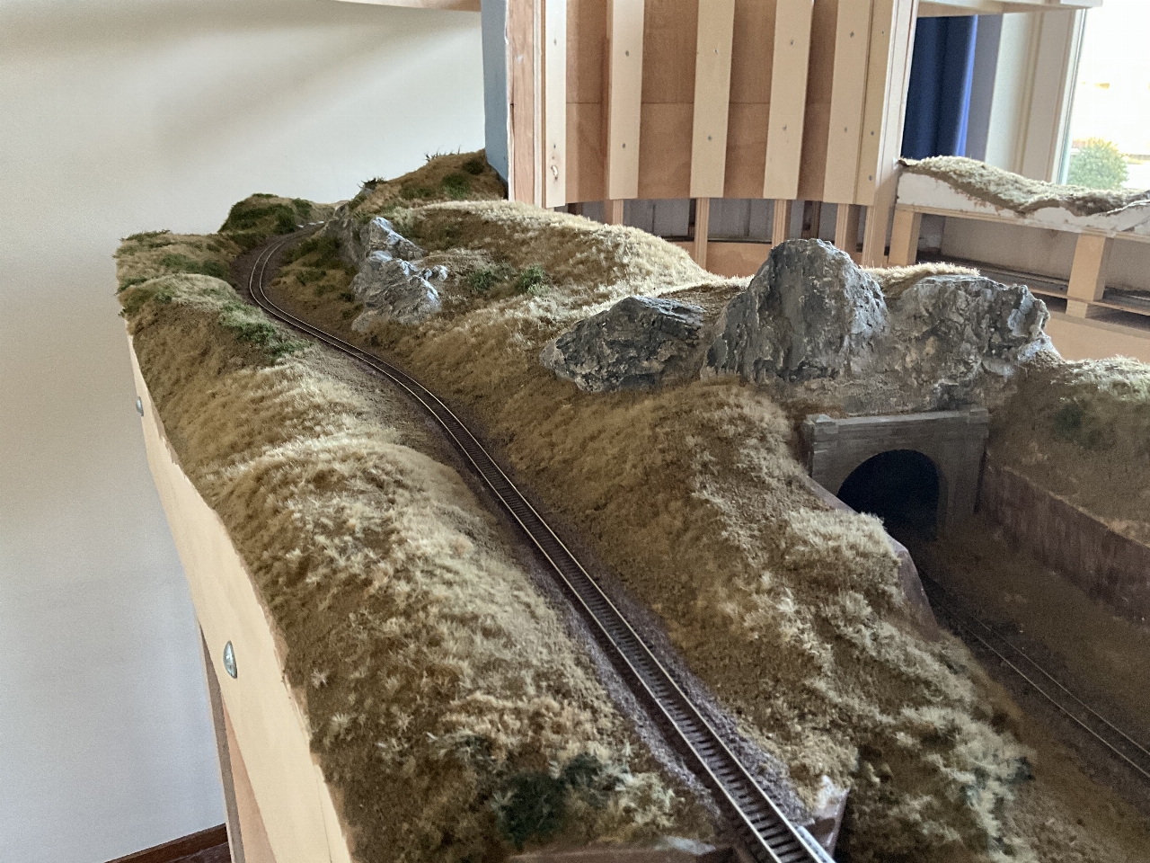Gestart met het aanbrengen van de vegetatie op de laatste, ronde module. Het spoor daalt geleidelijk in een ruime boog gelegen tussen een heuvel en een aflopend talud.