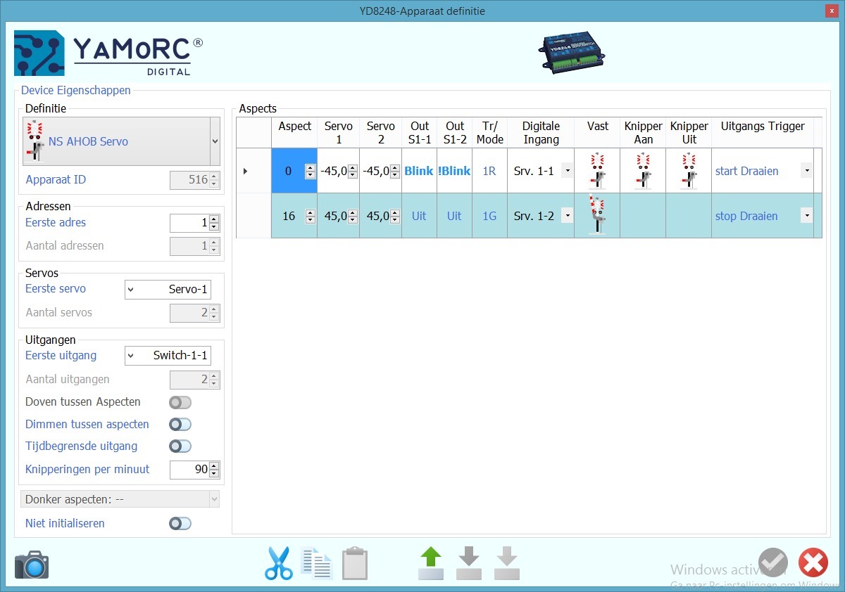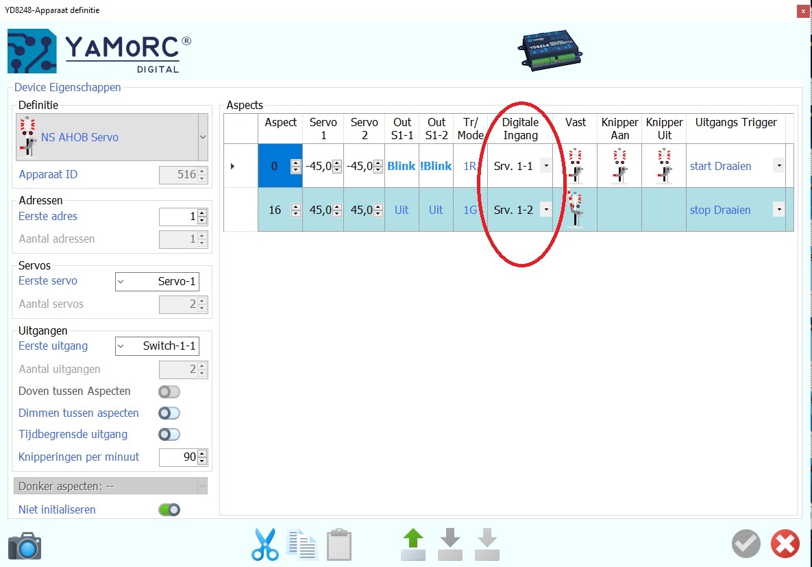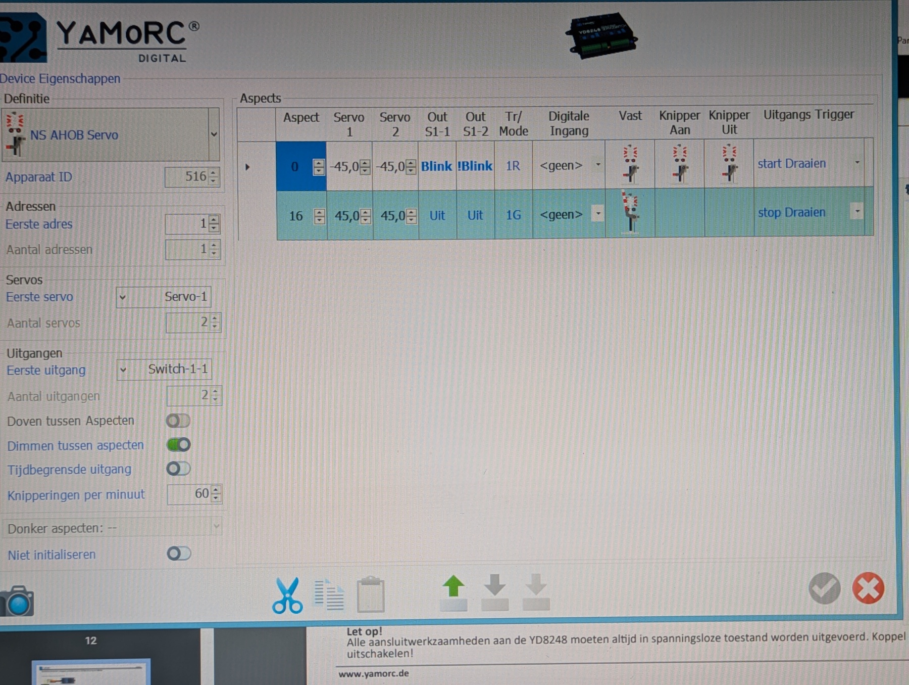 Ik ben niet vertrouwd met de decoder maar zit je digitale ingang nu op de connector van de servo? Moet je dan de gebruikte ingang dan niet instellen in de tabel waar je ook de servohoek instelt? De ingang staat daar nu op geen. Volgens mij zijn dat je fotocel ingangen ….. maar ik kan me vergissen.