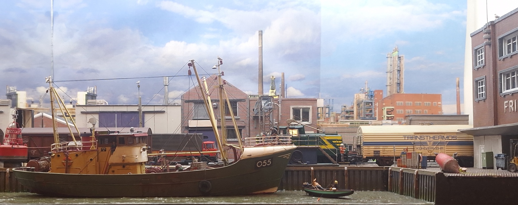 Met 'grote' havens (bijvoorbeeld Antwerpen of de Zeebrugse Achterhaven, om in Vlaanderen te blijven) heeft  "Visserskaai"  weinig te maken qua situering, decor. Industriele petroleuminstallaties, opgestapelde containers, moderne/grote havenkranen, opslagtanks, storen optisch bij jouw modelbouwverwezenlijking op de 'maquette'.
