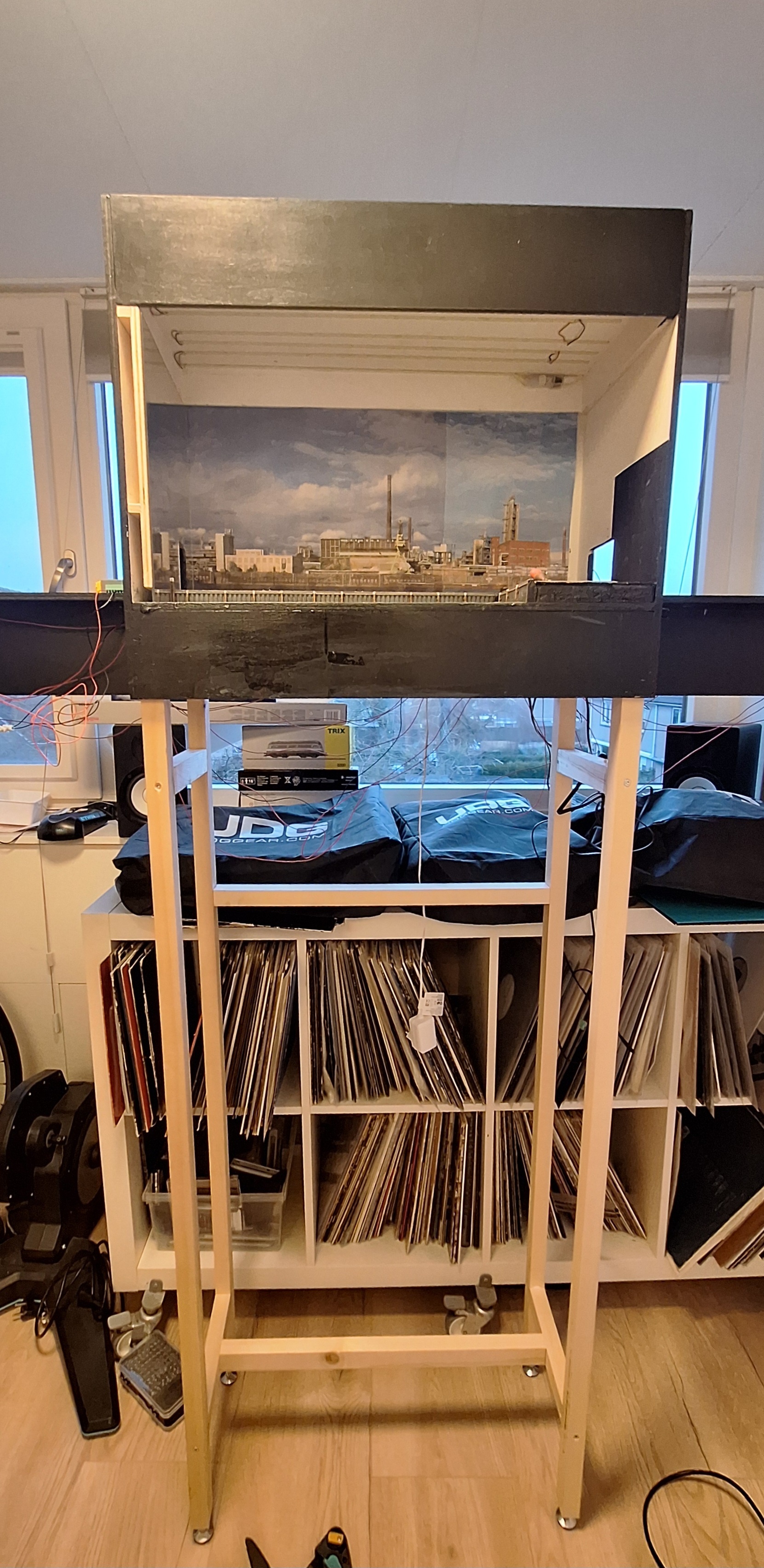 De baan staat nu op poten, dan kan ik eindelijk goed bij de onderkant, dus de bedrading eindelijk goed fixen, , dus de achtergrond fixen, dus de sfeer verlichting aansluiten, dus de automatisering goed inregelen, dus dus dus, die lijst gaat nog even door.