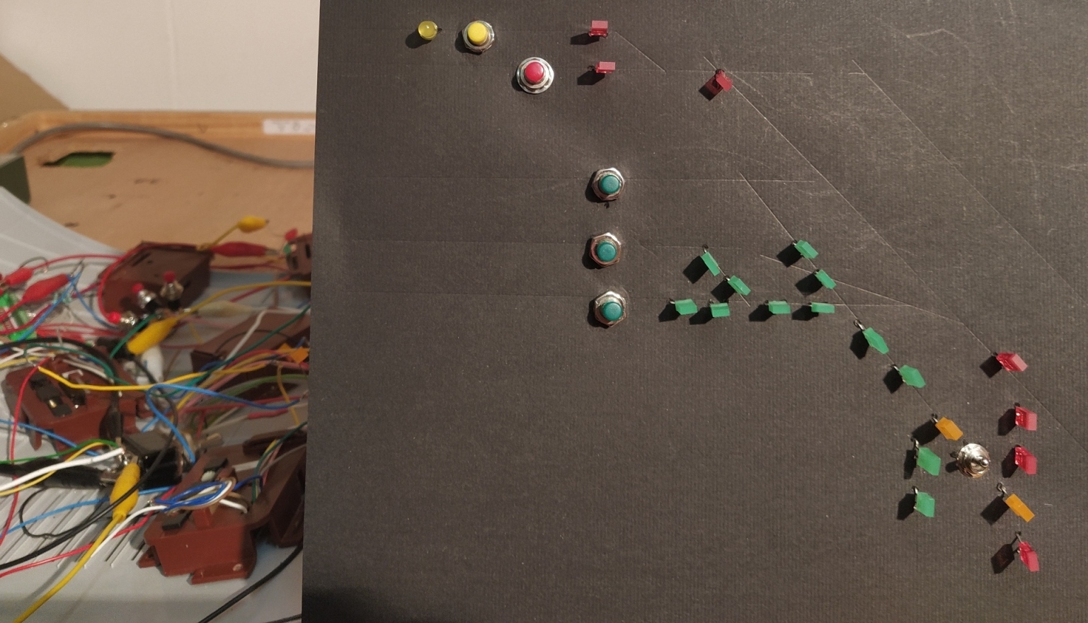 .... en dit is dan het experimenteel resultaat. 5 wissels, elk met 2 leds, en 5 begin / eindsporen met elk 1 bedieningsknop. En de schakelaar. En het werkt ook nog ! Nou ja, zolang ergens maar geen draadjes elkaar raken. Of er slechte verbindingen zijn. Of een krokodillenklem niet goed klemt. Of ....... Kortom: volgende keer een gekuiste versie met wat verschillende instellingen van de rijwegen.