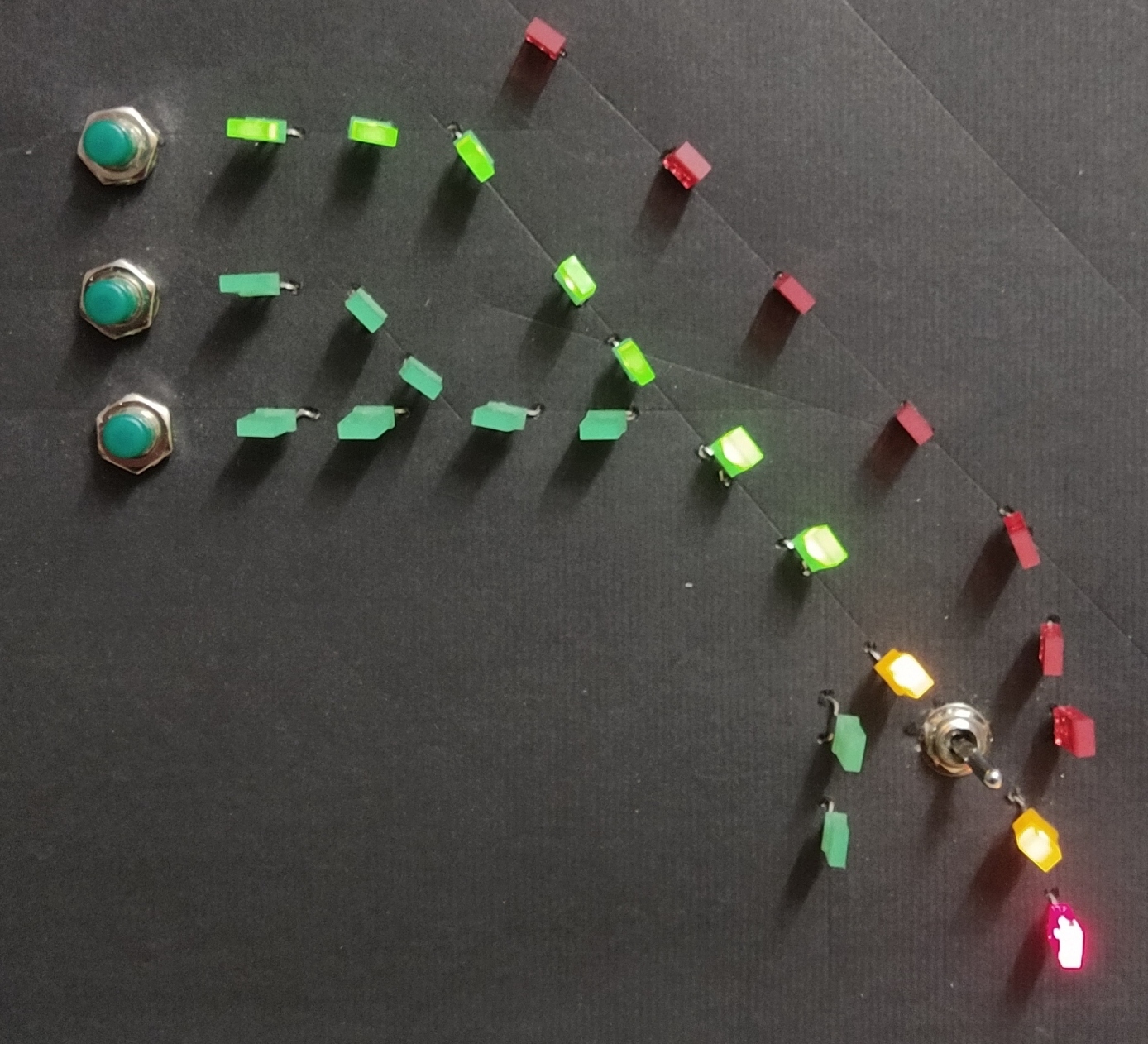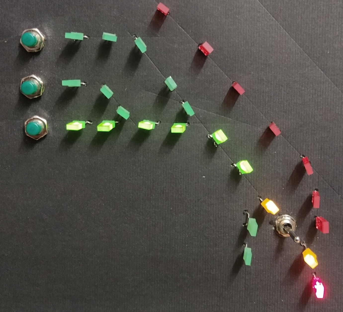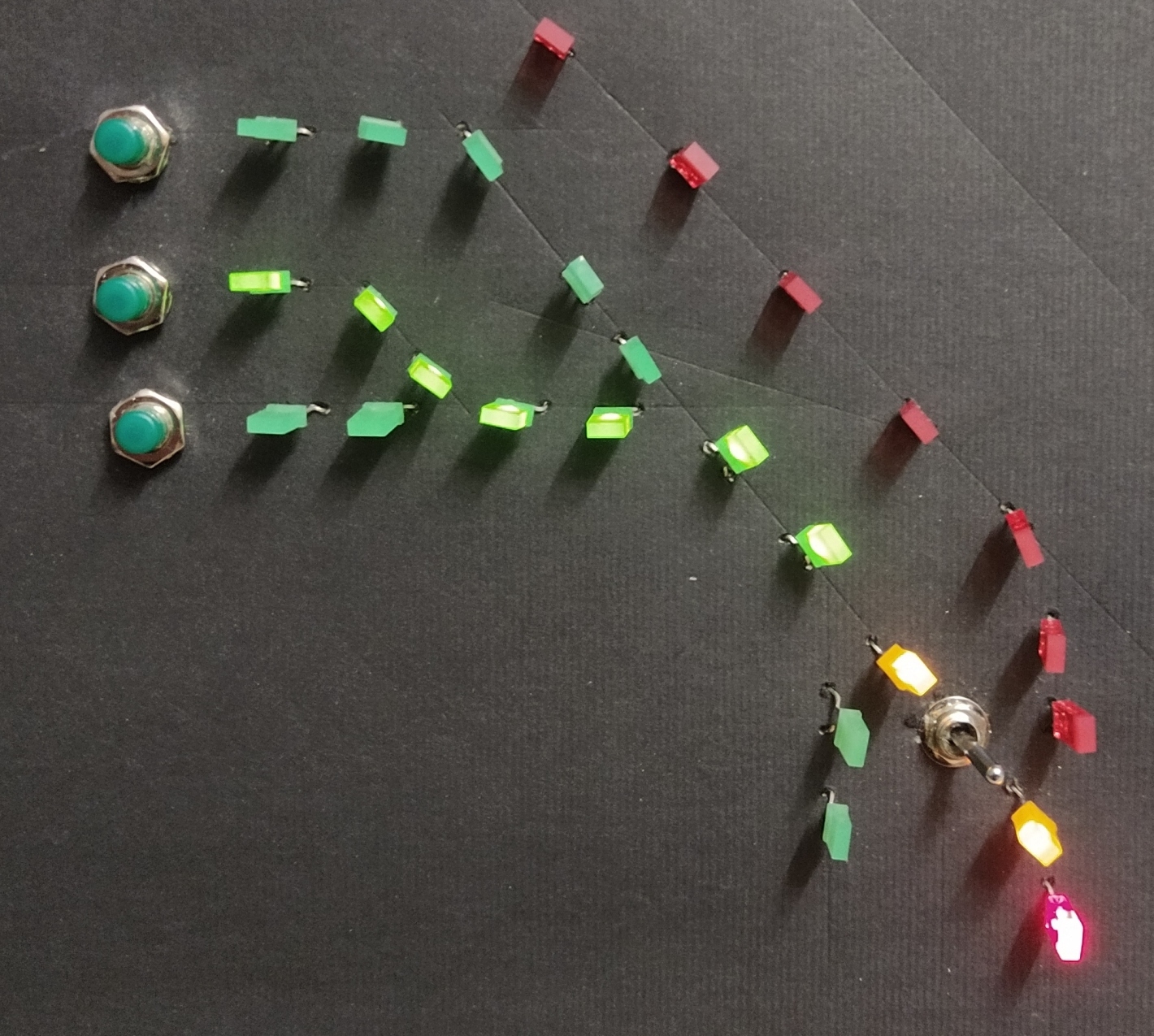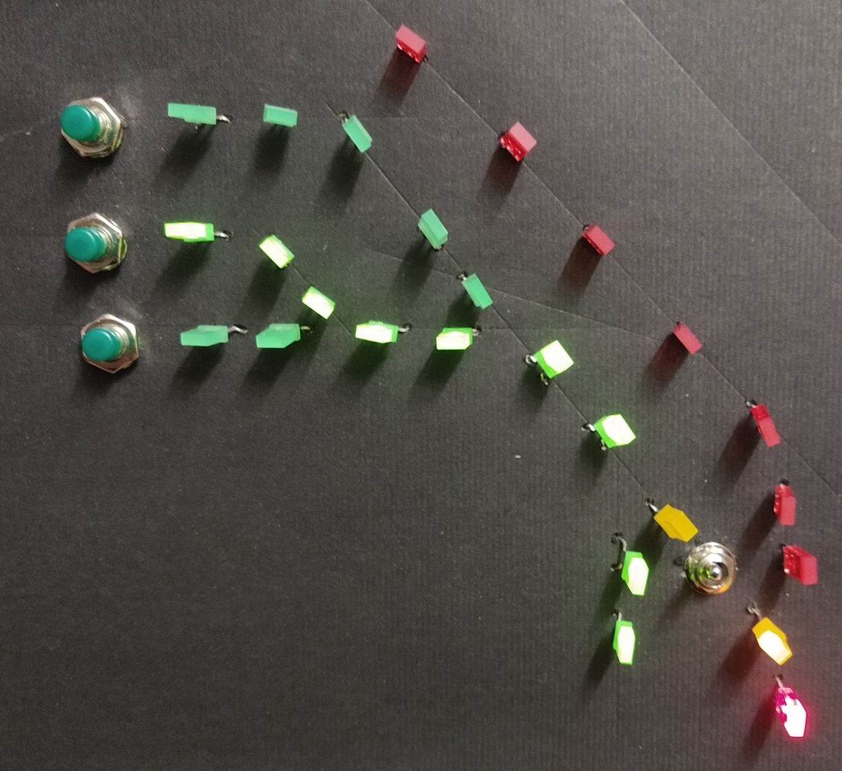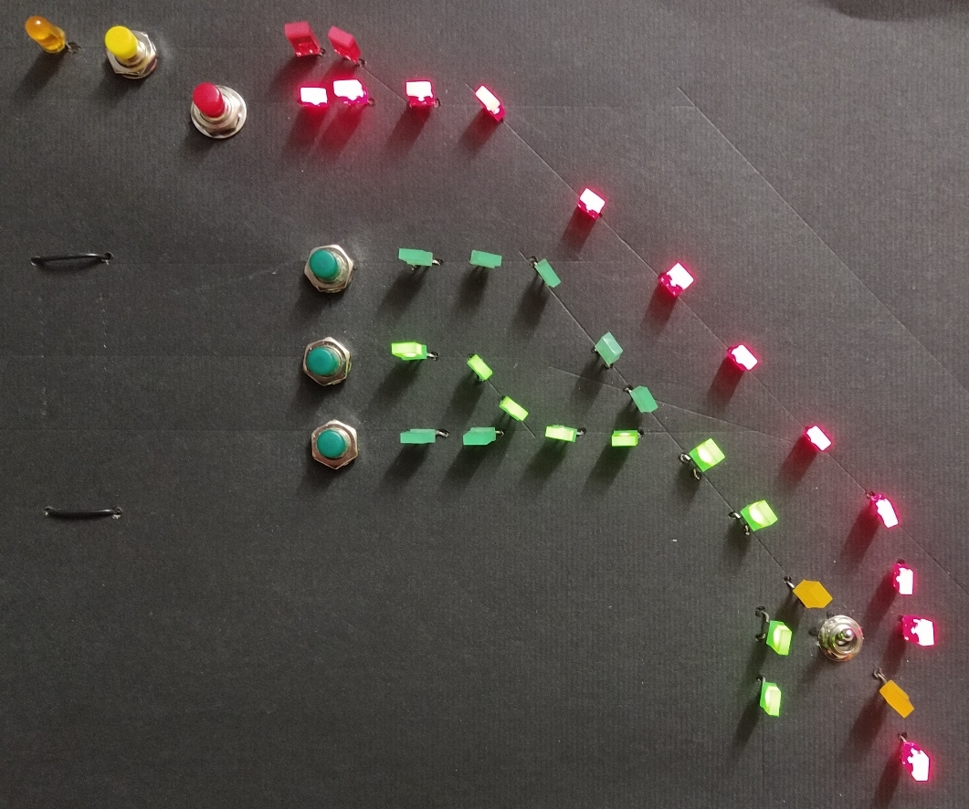 .... en dit is dan het experimenteel resultaat. 5 wissels, elk met 2 leds, en 5 begin / eindsporen met elk 1 bedieningsknop. En de schakelaar. En het werkt ook nog ! Nou ja, zolang ergens maar geen draadjes elkaar raken. Of er slechte verbindingen zijn. Of een krokodillenklem niet goed klemt. Of ....... Kortom: volgende keer een gekuiste versie met wat verschillende instellingen van de rijwegen.