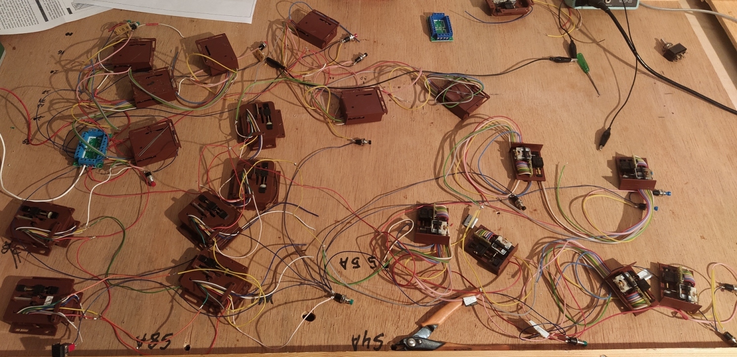 .... en dit is dan het experimenteel resultaat. 5 wissels, elk met 2 leds, en 5 begin / eindsporen met elk 1 bedieningsknop. En de schakelaar. En het werkt ook nog ! Nou ja, zolang ergens maar geen draadjes elkaar raken. Of er slechte verbindingen zijn. Of een krokodillenklem niet goed klemt. Of ....... Kortom: volgende keer een gekuiste versie met wat verschillende instellingen van de rijwegen.