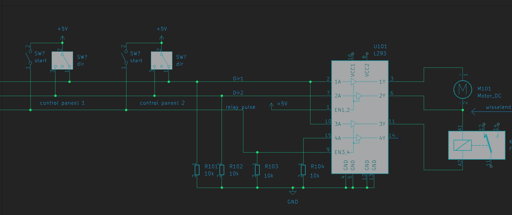 Met een 3 standen schakelaar, MTS103/ ON-OFF-ON kan je de inputs van de L293 direct aansturen. Een neutrale middenstand is nodig omdat je meer dan 1 controle paneel heb. Als een paneel niet gebruikt wordt, moet die schakelaar in de OFF positie staan. Met een aparte moment switch (start) kan je het relais bekrachtigen waardoor de schijf gaat draaien. Je kan in principe zoveel als mogelijk schakelpanelen gebruiken als je wilt.