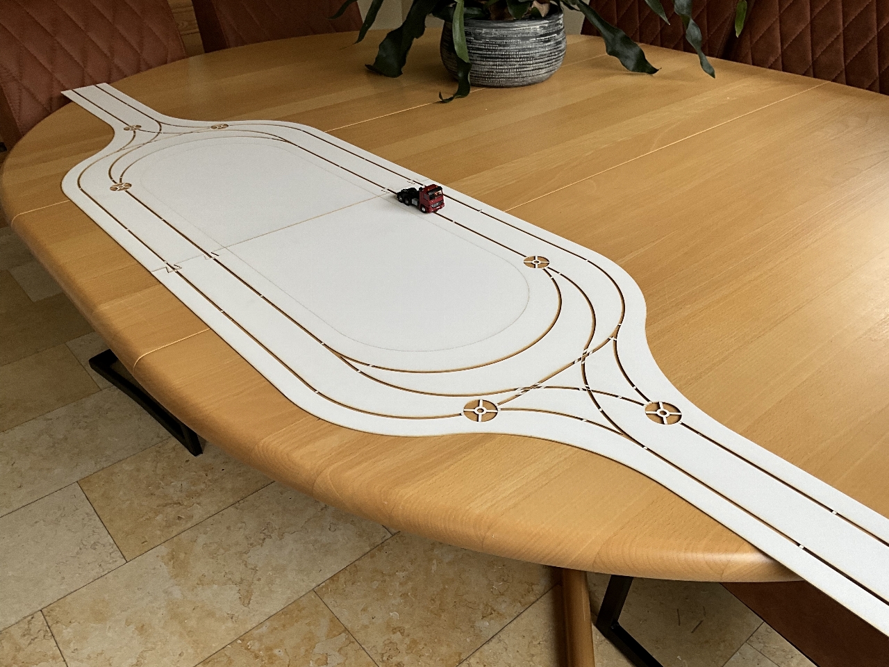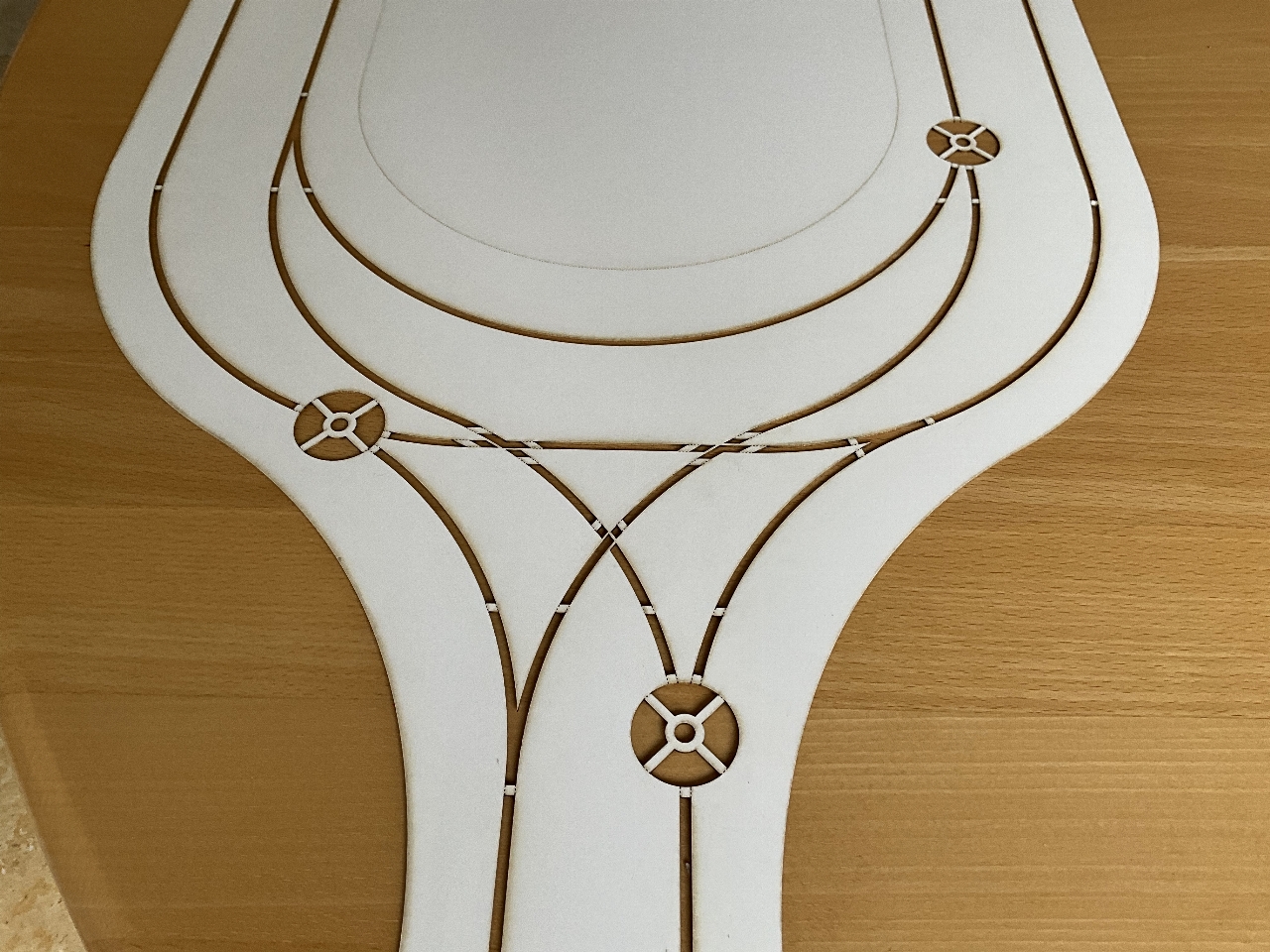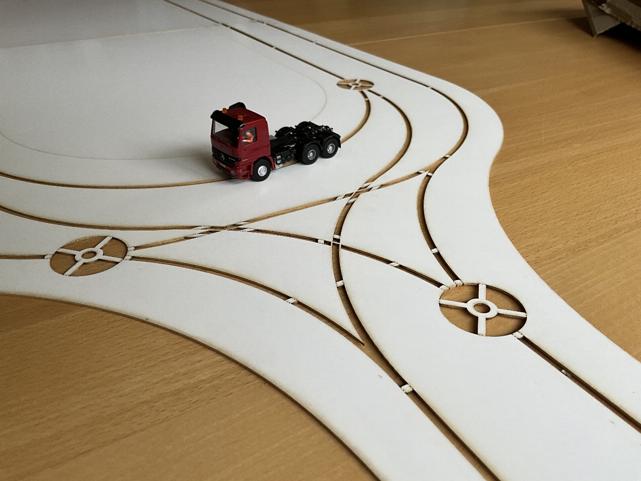 De rotonde voor het schaduwstation is in bestelling en wordt nu gelaserd. Verder nog aan het rommelen geweest met de verdere invulling van deze modelbaan. Aan de linkerkant komt een recreatieplas met strand, toegankelijk door een landweggetje. Kijken of ik nog ruimte heb om een aansluiting te maken met de N-weg middels een parkeerstrook. De weg en de spoorlijn gaan onder een eco-viaduct door naar het schaduwstation. Dit station krijgt dan twee lagen, een voor de auto's (rotonde met parkeerhavens) en een voor de treinen. De rechterkant is nu ook aangepast. De spoorlijn is nu meer recht getrokken en het landweggetje gaat via een onderdoorgang onder het spoor door en klimt met een flauwe boog naar boven, het bos in. Ook hier weer een eco-viadukt.