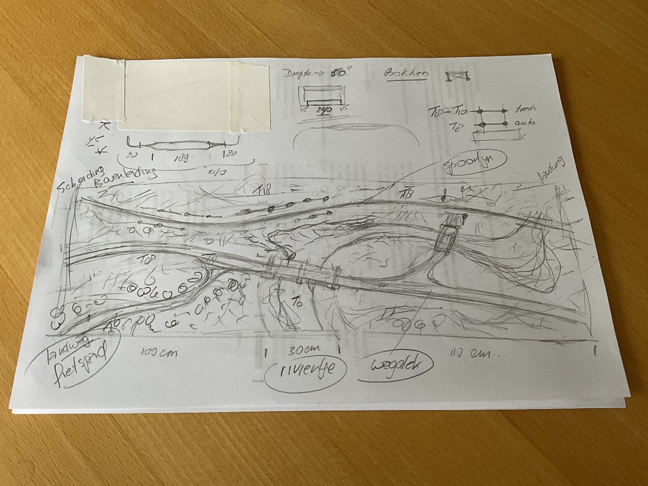 Nieuw baanplan. Toch maar niet meer zo groot bouwen. Zoals gezegd, is het thema van deze modelbaan het landschap op de Veluwe. Exact nabouwen is bij mij niet mogelijk. Centraal ligt een riviertje. Een enkelvoudige spoorlijn en een weg lopen min of meer parallel aan de loop van dit riviertje.
