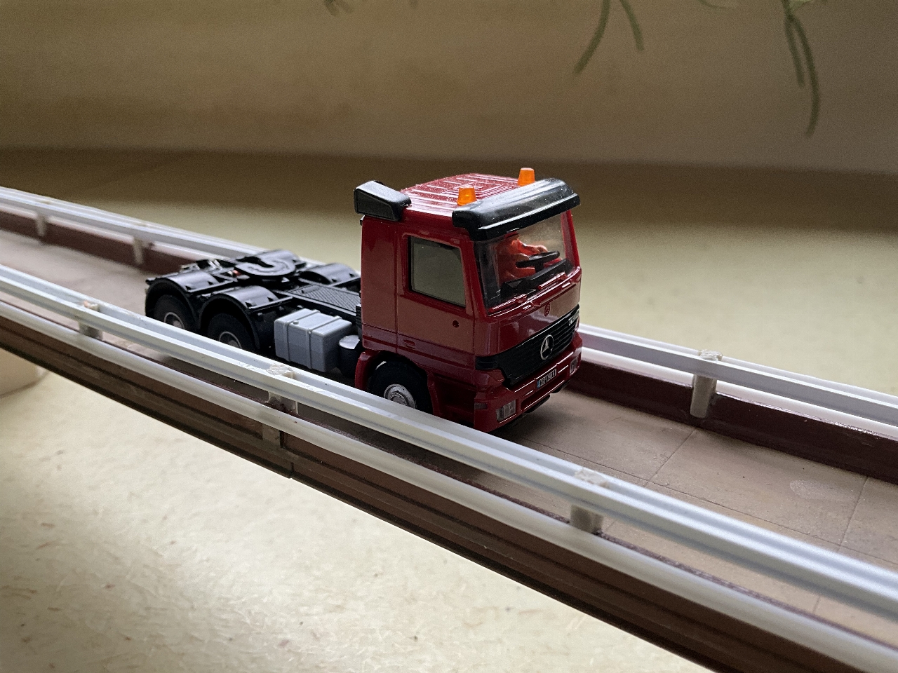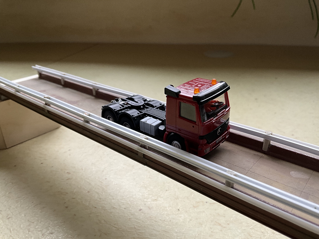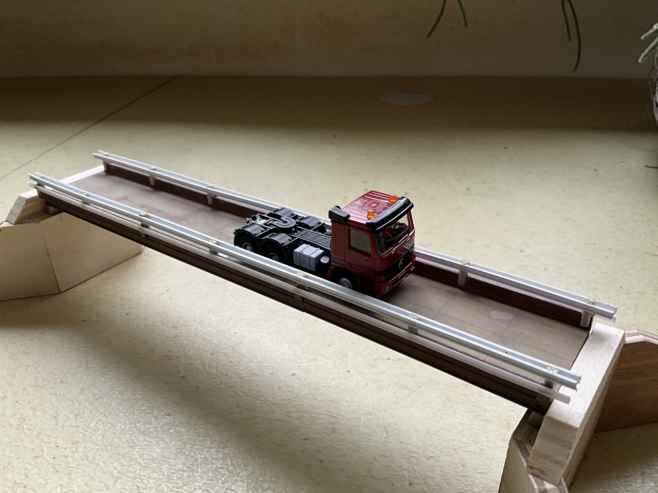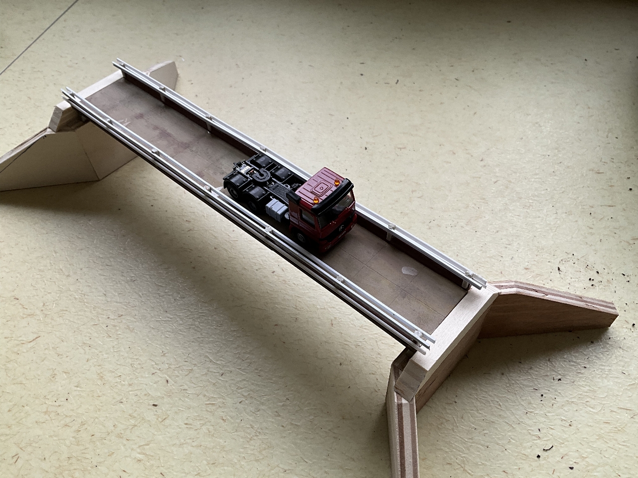 Vandaag maar eens begonnen met het bouwen van de autobrug. Deze brug op de foto hierboven is voor mij natuurlijk te ingewikkeld om te bouwen. In mijn rommelkist vond ik nog een brugdeel van mijn N-modelbaan. Deze een beetje gepimpt en tevens twee bruggenhoofden van multiplex gemaakt. Deze smeer ik in met een mengsel van MIFOSHAPE! Laten uitharden en flink schuren, geeft een beetje idee van beton.