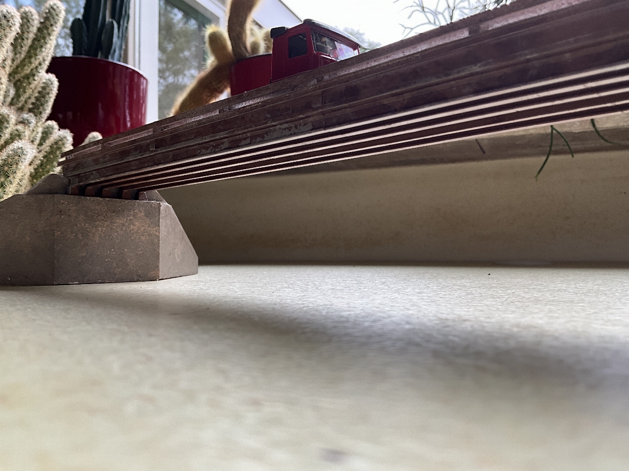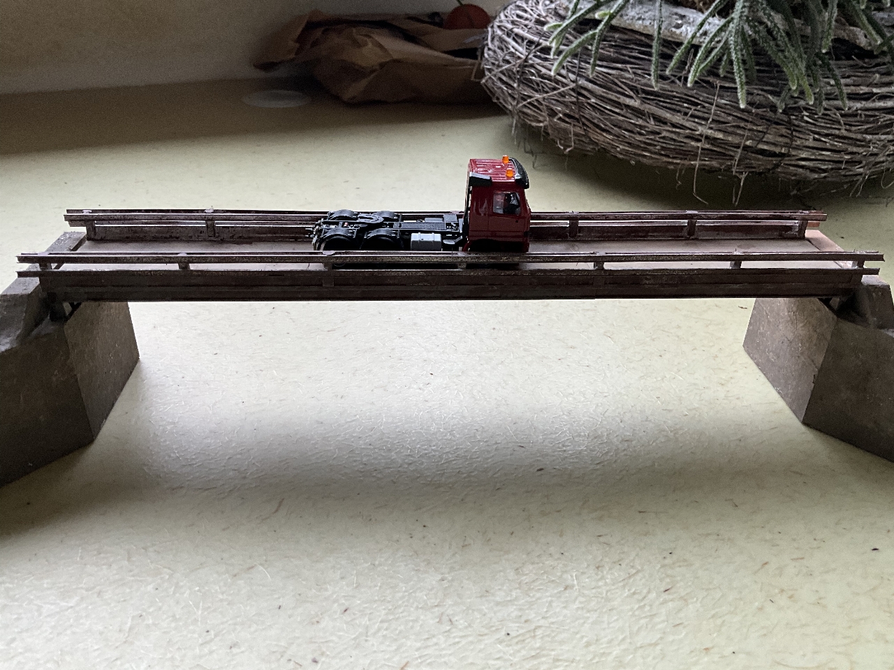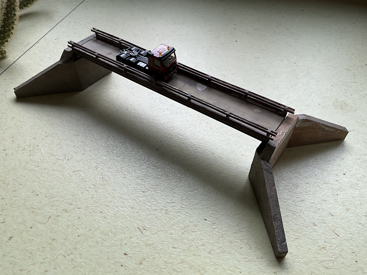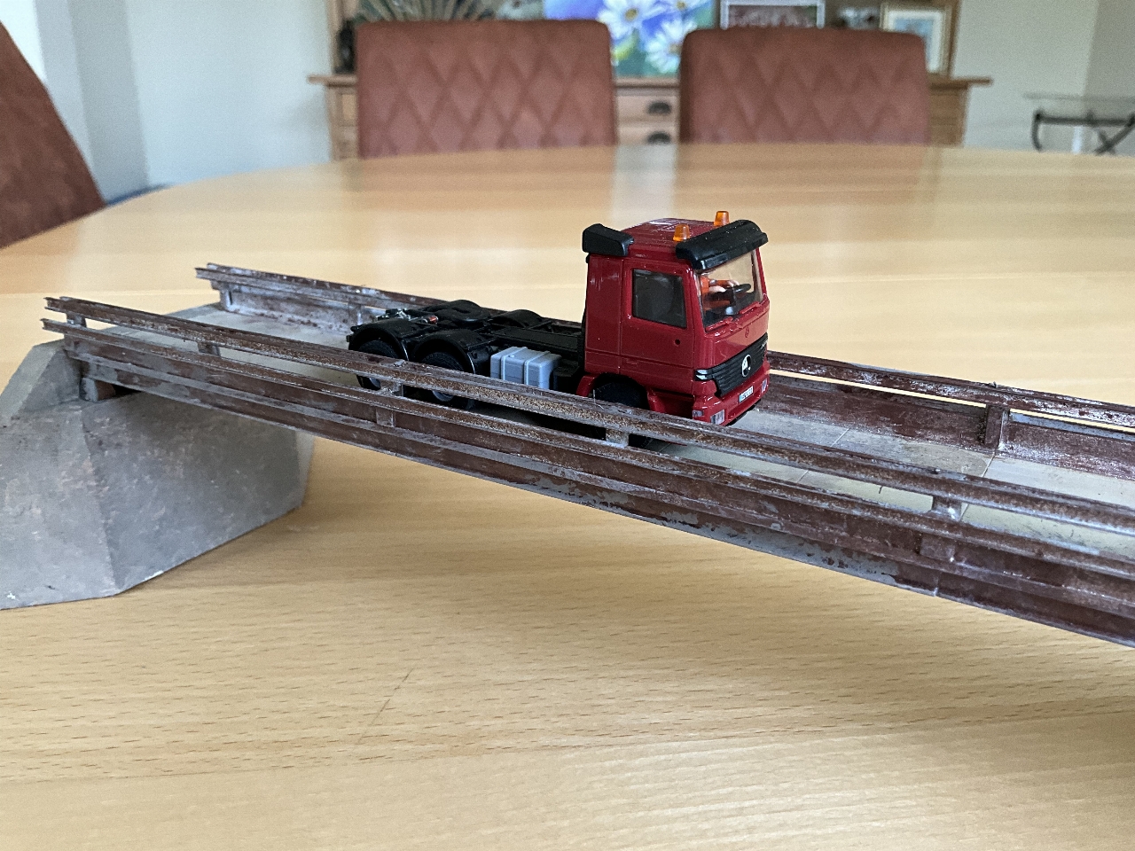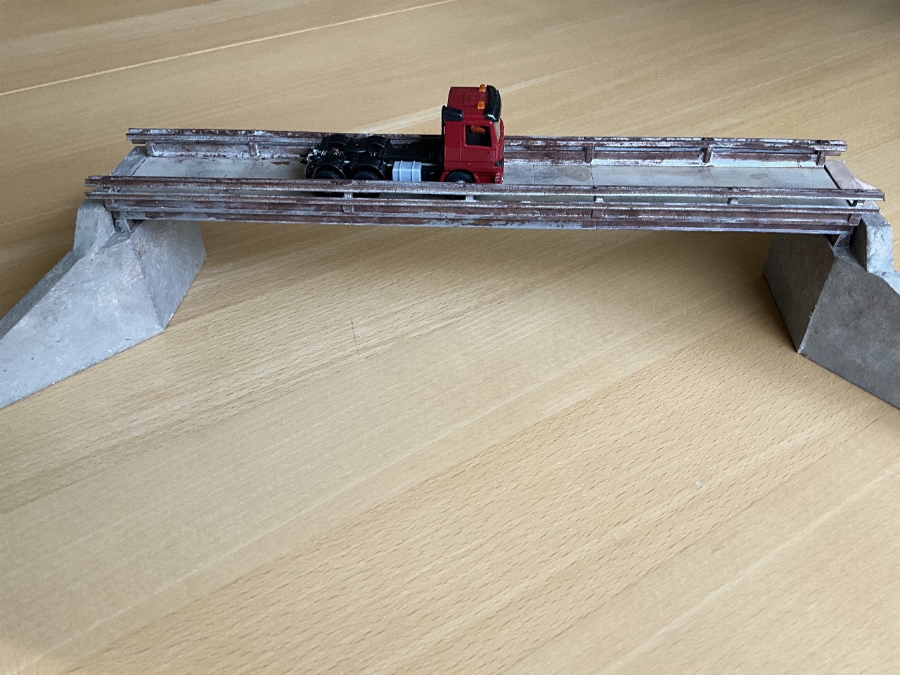 Vandaag maar eens begonnen met het bouwen van de autobrug. Deze brug op de foto hierboven is voor mij natuurlijk te ingewikkeld om te bouwen. In mijn rommelkist vond ik nog een brugdeel van mijn N-modelbaan. Deze een beetje gepimpt en tevens twee bruggenhoofden van multiplex gemaakt. Deze smeer ik in met een mengsel van MIFOSHAPE! Laten uitharden en flink schuren, geeft een beetje idee van beton.