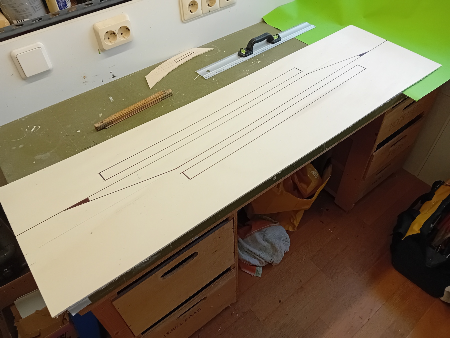 Om een beeld te krijgen van de haalbaarheid even wat lijnen op de beoogde bovenplaat gezet.