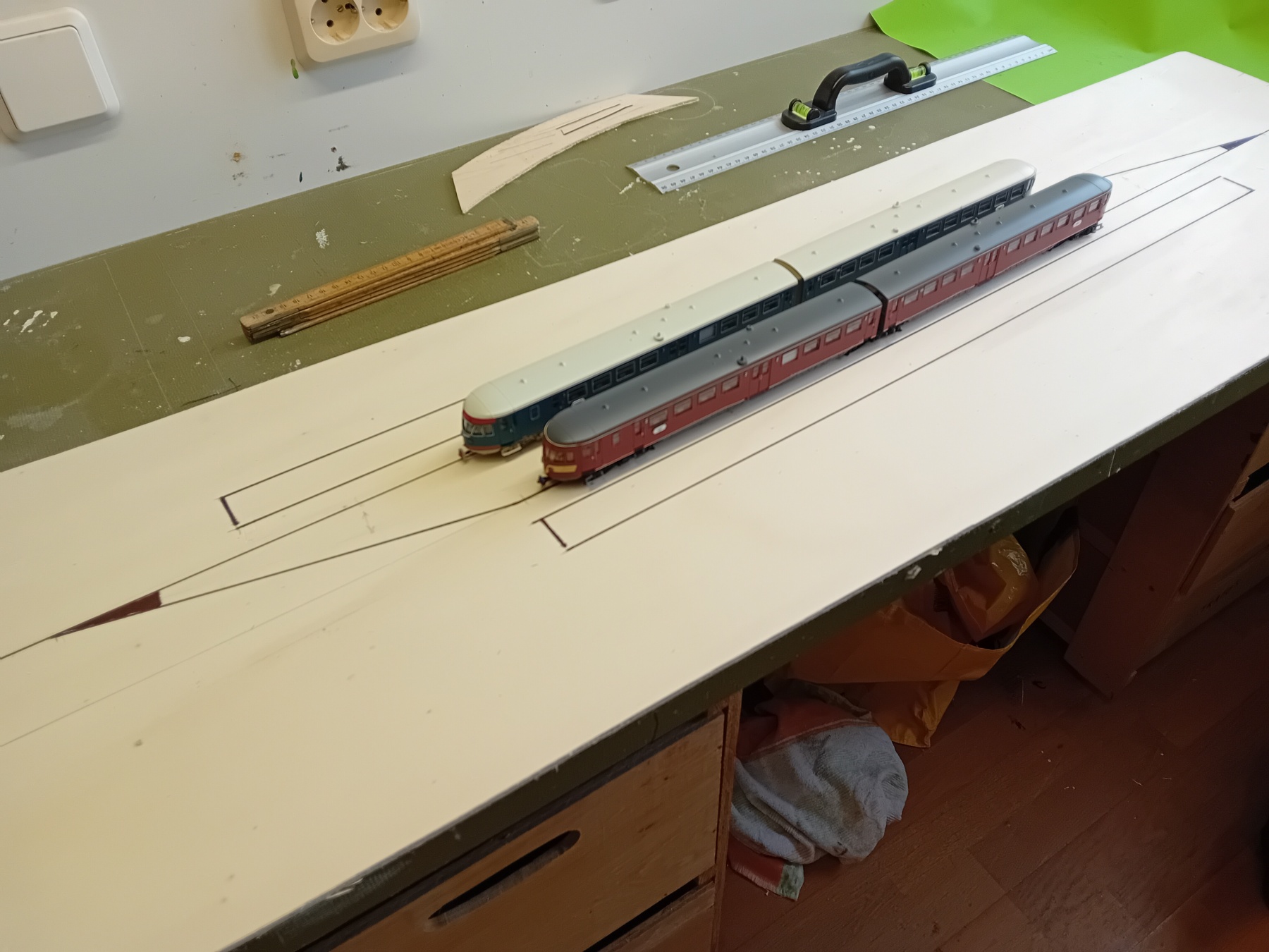 Bij nader inzien vond ik de bakindeling niet zo handig. Bij het bedenken wat er allemaal aan elektronica in moet bleek dat geplande vakje te klein. Nu zou ik de rest in het lege vak (rechts op het vorige plaatje) kunnen onderbrengen maar de afstand tussen de twee vakken maakt het niet handiger. Dus de hele zaak opgeschoven zodat er een ruim vak ontstaat waar alles in past. Midden tussen de twee zijbakjes komt nog een kabelgootje waar de draden naar de spoorsecties en het rechter wissel in komen.