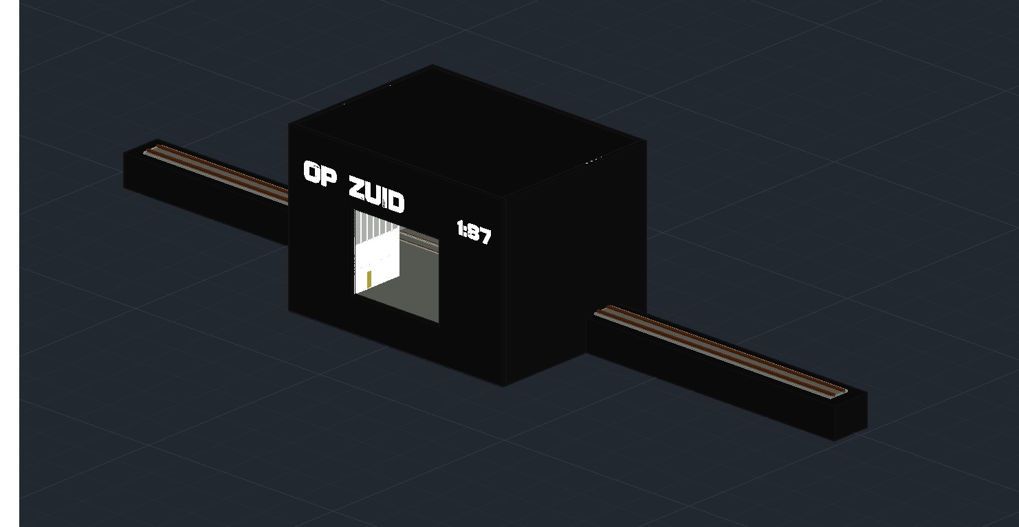 Ondertussen speel ik nog met het idee om aan de linkerkant het schaduwstation te vervangen door nog een “kijkdoos” met daarin het eindpunt met stootblok. Dit zal zich afspelen aan de straatkant van de loodsen en hier kijk je dus tegen een loods aan ipv water. Deze scene staat los van de andere en zal bijvoorbeeld ook tijdens zonsondergang of helemaal in het donker kunnen afspelen met straatverlichting aan. Ook aan de rechterkant zou ik een heel klein kijkdeel kunnen maken met de entree van de haven zoals bij de Lentstraat. De trein komt achter het gebouwtje vandaan en rijdt de poort van de waalhaven binnen. Al met al zou het geheel dan op 1,05m uitkomen en 25 cm diep. Echter moet ik dan wel rekening houden met de lengte van de trein. Een hippel met Gs gaat dan prima, maar ik denk dat een 6400 dan als losse loc op het toneel moet verschijnen, wat opzich ook geen ramp is.. tot zover mijn fantasie.