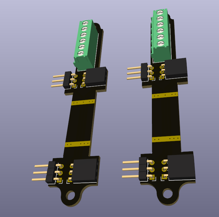 Daarom heeft de verdeelprint aan 1 kant, schroefterminals en aan de andere kant een socket waarin ik een schroefterminal kan prikken. Zo wil ik de verbindngen maken tussen bakken.