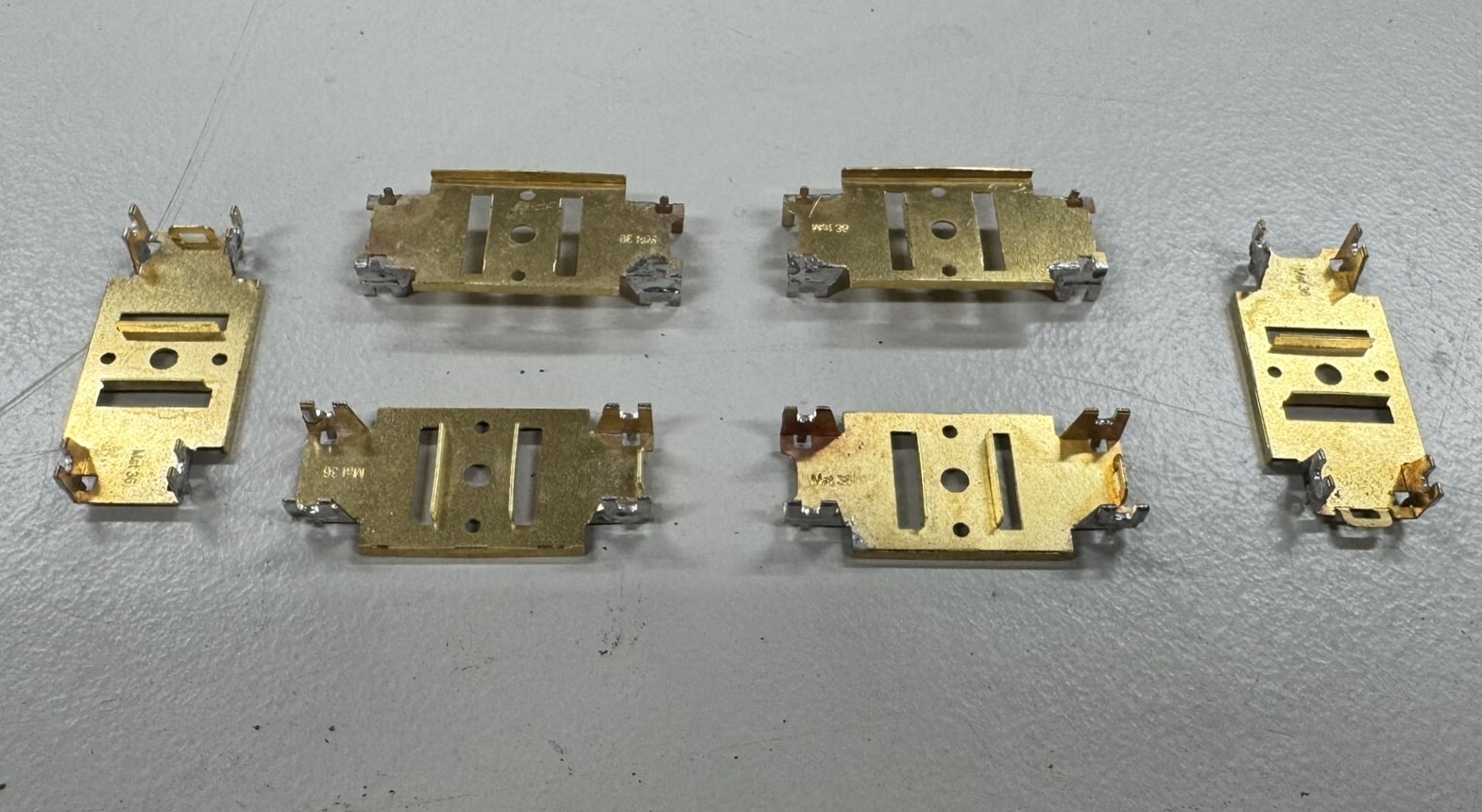 Dan volgt nog het verwijderen van de tabs op het dak met een zijsnijtang. Vervolgens de restanten met soldeer vol solmuren. Afvijlen en vervolgens met korrel 600 waterproof glad maken. Als je toch aan het solmuren ben neem dan meteen de IN- en UITbordjes mee als je naoorlogse versie maakt. Soldeer ook de messing dak details er op, behalve de isolatorpot voor de luchtleiding. Die zit in de weg voor het gladmaken van overgang tussen de kop en de kap. Ook de stroomlijn kano's laat ik voorlopig er af, komt later wel.