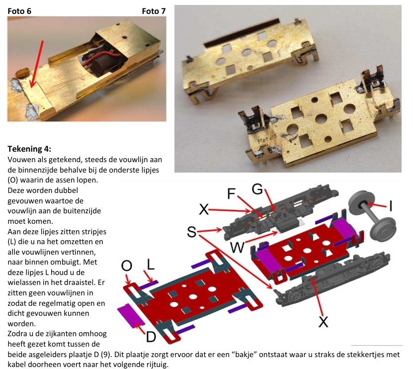 De lip met de aanduiding L ontbreekt waardoor het wielstel niet opgesloten kan worden. Verder onderdeel D ontbreekt nodig voor de as oplegging, ook de uitsparingen in het draaistel ontbreken daarvoor. Ik heb de indruk dat dit onderdeel voor de ElD-4 niet nodig is. De as oplegging moet dus gedaan worden in de opstaande as geleiding. Lijkt mij geen probleem want de as geleiding is dik genoeg. Alleen het oplegvlak mooi vlak maken.