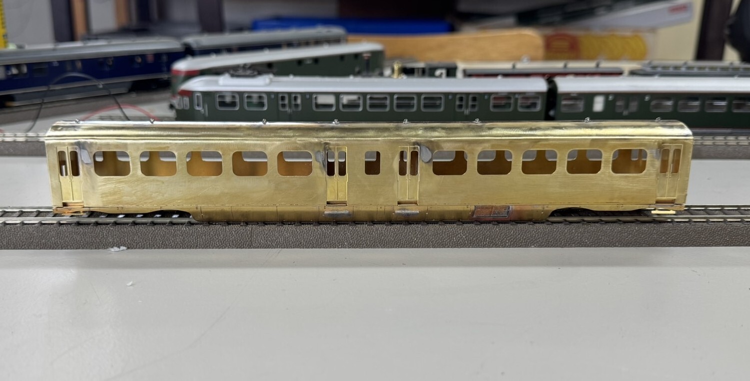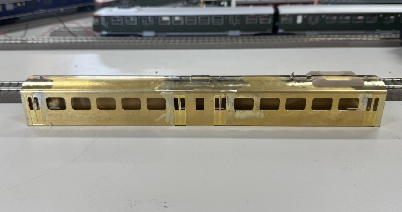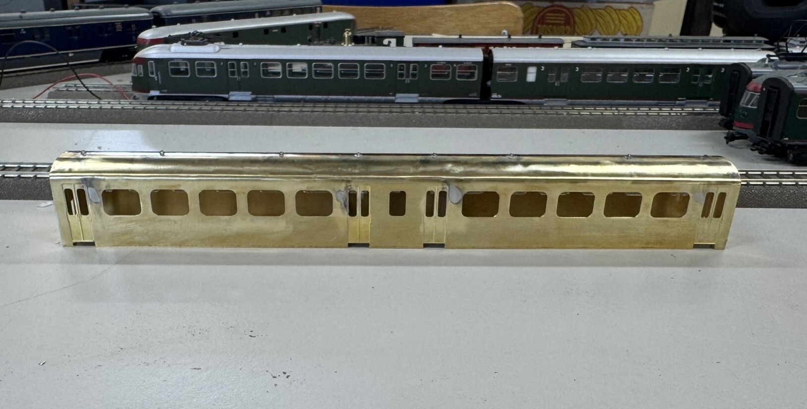 Dan volgt nog het verwijderen van de tabs op het dak met een zijsnijtang. Vervolgens de restanten met soldeer vol solmuren. Afvijlen en vervolgens met korrel 600 waterproof glad maken. Als je toch aan het solmuren ben neem dan meteen de IN- en UITbordjes mee als je naoorlogse versie maakt. Soldeer ook de messing dak details er op, behalve de isolatorpot voor de luchtleiding. Die zit in de weg voor het gladmaken van overgang tussen de kop en de kap. Ook de stroomlijn kano's laat ik voorlopig er af, komt later wel.
