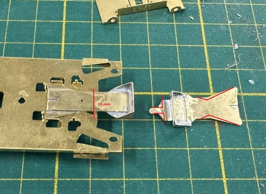 Als eerste de zwaluwstaart heb ik vergroot naar 10 mm zodat de geleide nok onderop verder kan wegdraaien. De koppelboom moet versmald worden zodat hij vrij loopt van de zijwanden van het doosje(rode V-lijn). Dan nog de geleide pen aan de voorkant waar de schuine kantjes weggehaald zijn, hierdoor kunnen de stekkers nu volledig in elkaar klikken.