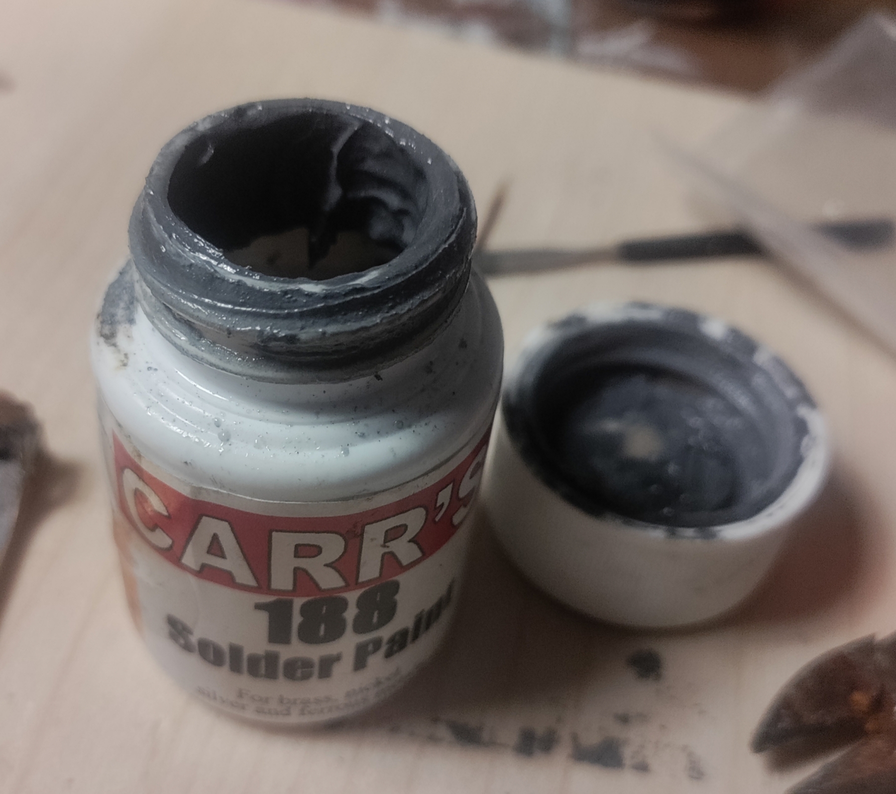 Dit spul. Feitelijk wat jij al schreef: piepkleine stukjes soldeer (hier eerder poeder) vermengd met soldeerwater tot een dunne pasta. Met een kwastje of cocktailprikker breng je wat aan op het werkstuk, vlammetje of bout erover en het verandert in een dunne vloeibare soldeerverbinding