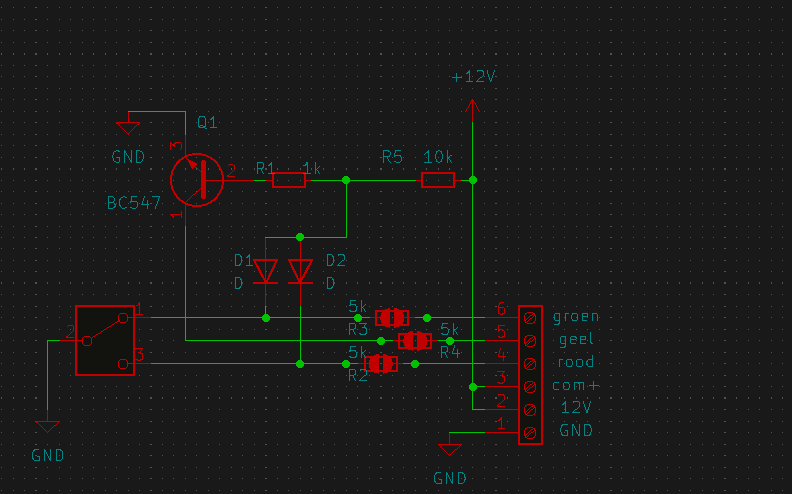 de transistor moet de gele led open sturen als de schakelaar in de floating middenstand staat.