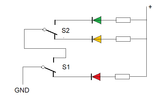 Zoals getekend brandt de rode led. Zet S1 omhoog, dan kun je met S2 kiezen tussen geel en groen.