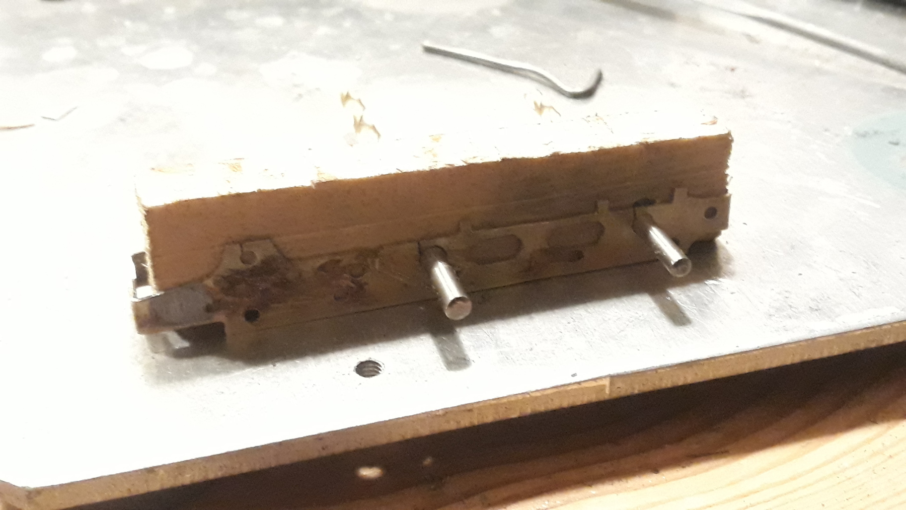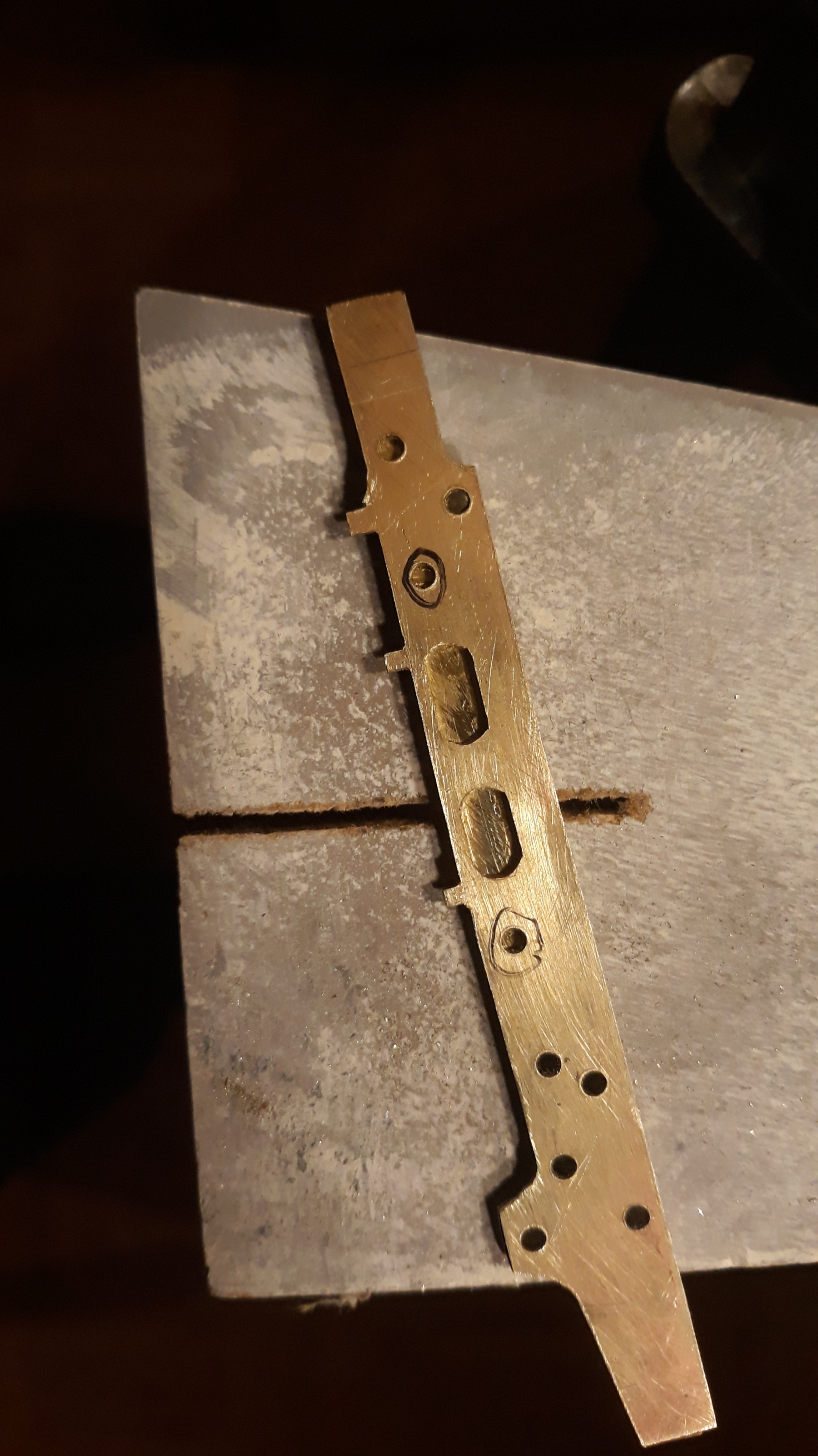 Boren, zagen, vijlen. Zorg dat de twee frameplaten echt gelijk worden en de kopse kanten van het materiaal netjes haaks. Het beste is iets te ruim uitzagen, en dan strak vijlen.