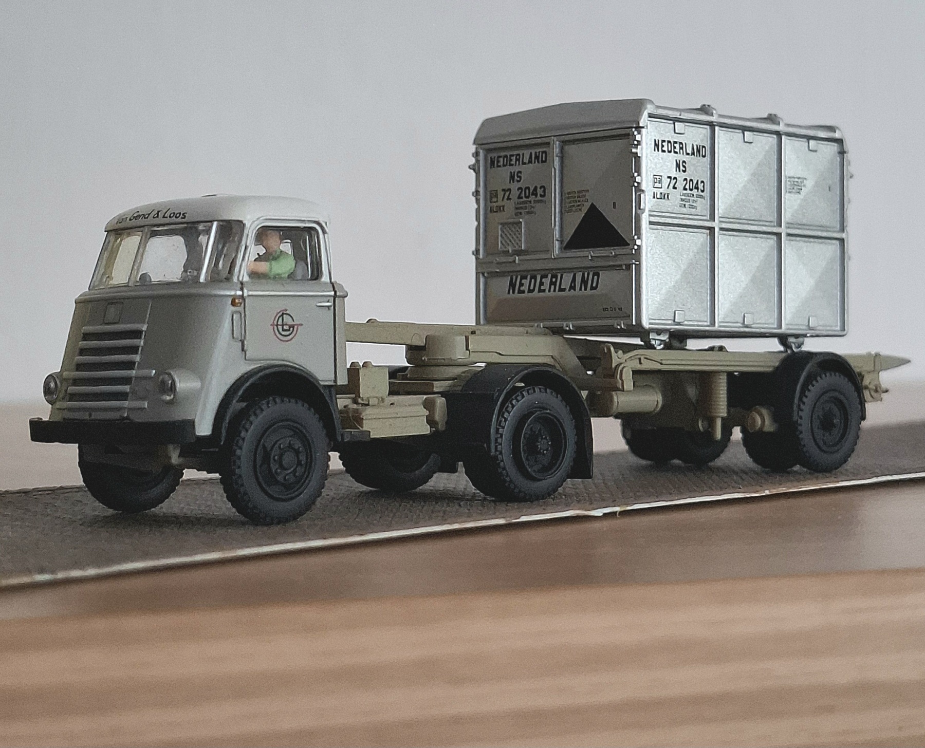Het karakter van zo'n model wordt verbeterd wanneer deze is uitgerust met een chauffeur. In dit geval eentje met opgestroopte mouwen die bezig is met het zware stuurwerk van de DAF.
