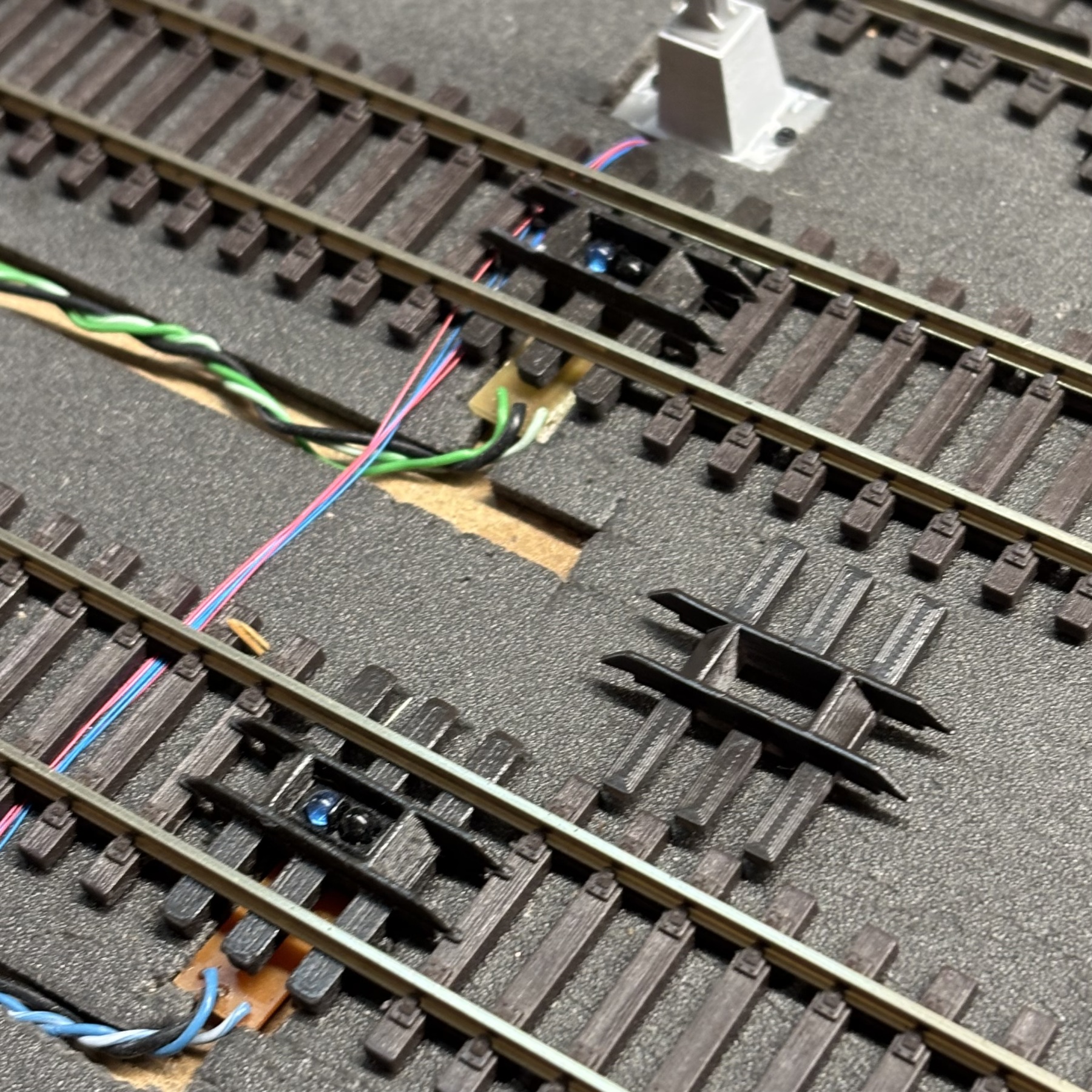 Ik gebruik voor bezetmelders de tcrt5000 die ik in geprinte houders onder de rails plaatst. Uit de rails heb ik drie bielzen verwijderd en vind dat ze op deze manier niet storend werken. Onder de voor en achterzijde van mijn locomotieven en onder de laatste wagens van een trein heb ik reflecterende stripjes geplakt. Een nadeel kan zijn dat bij direct zonlicht deze sensoren geactiveerd worden maar op mijn treinzolder komt weinig zon…