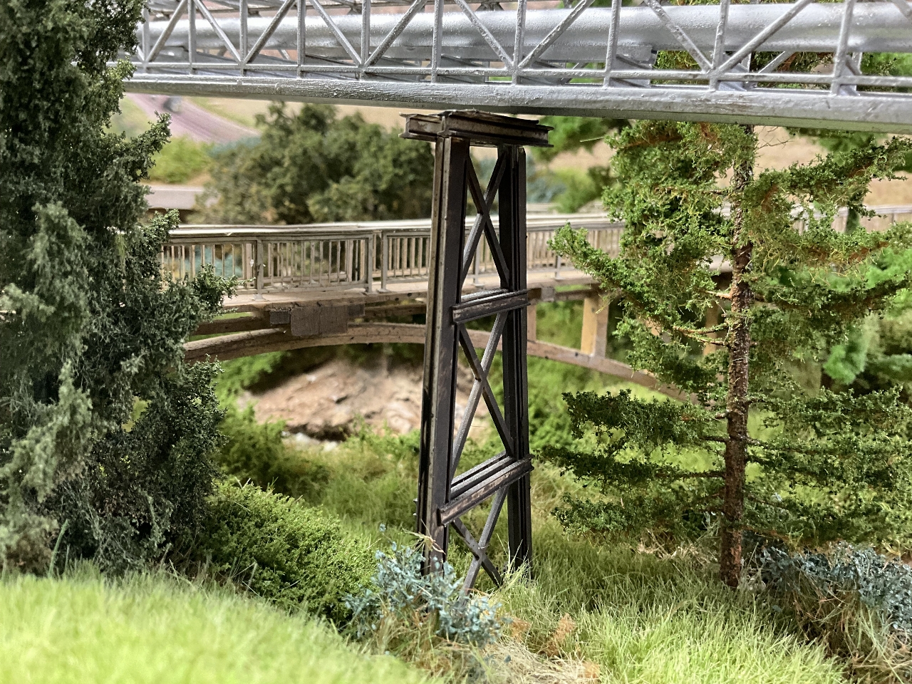This is an image of a highly detailed miniature model, likely from a model railroad or diorama. The scene shows a small bridge with a metal framework supported by a large, sturdy wooden trestle structure, designed to hold up the bridge above ground level. There are trees and lush green foliage around the area, contributing to a realistic natural setting. The bridge itself is intricately designed, with finely crafted railings and a wooden deck, giving it a rustic and industrial look. The scene is filled with miniature landscaping, including bushes and grasses, making it appear lifelike and well-crafted. The overall effect is a picturesque and detailed representation of a bridge in a natural landscape, likely part of a larger model train or scenic display.